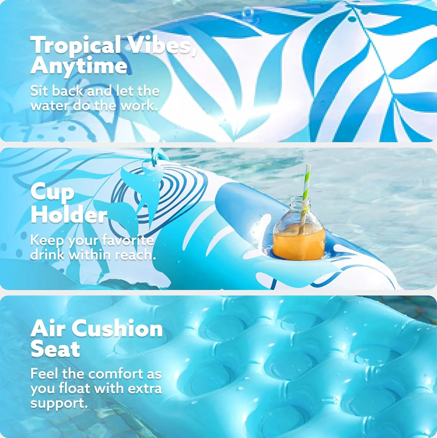 ·VERSATILE USAGE: Ideal for pool parties, beach trips, or simply soaking up the sun in your backyard, our XL Tropical Leaves Inflatable Pool Chairs add a touch of tropical luxury to any water-related activity.