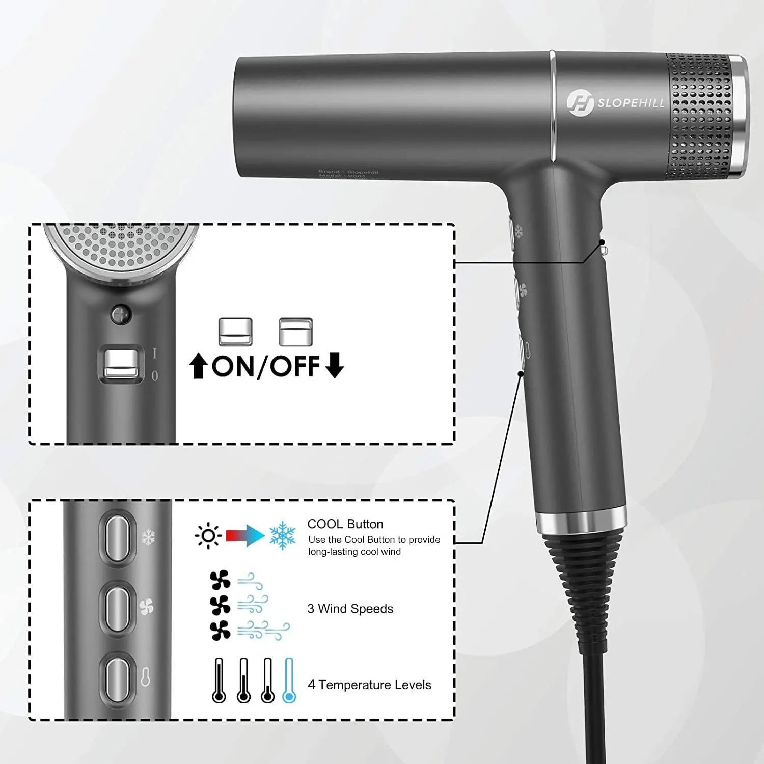 ·Convenient button + Memory Function Switch: Fashionable and elegant button, 3 speed wind speed, 3 temperature equipped with LED light display + cold air button. The independent open key has the memory function. If you open it again, it will follow the previous setting. Three air nozzles can meet any modeling requirement.