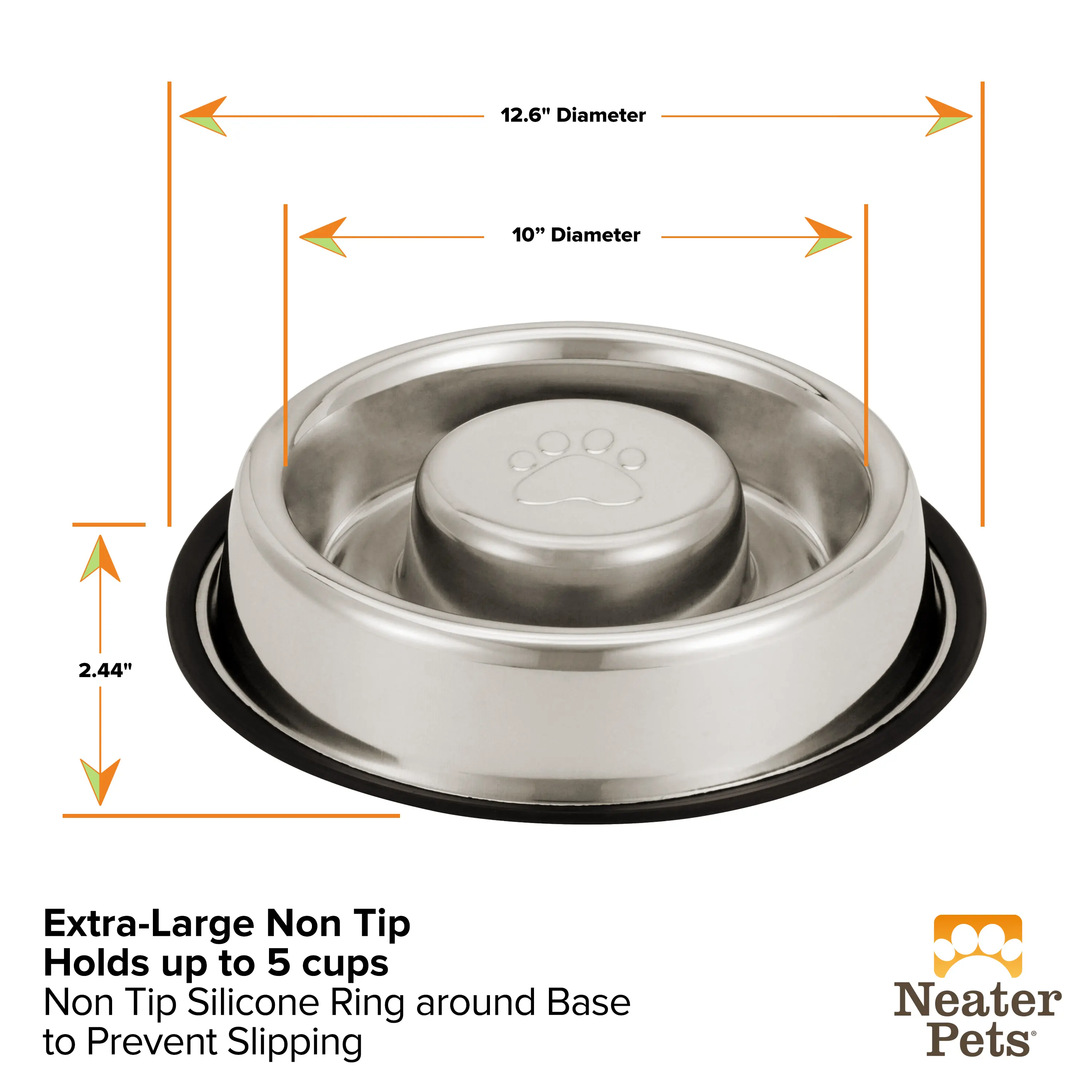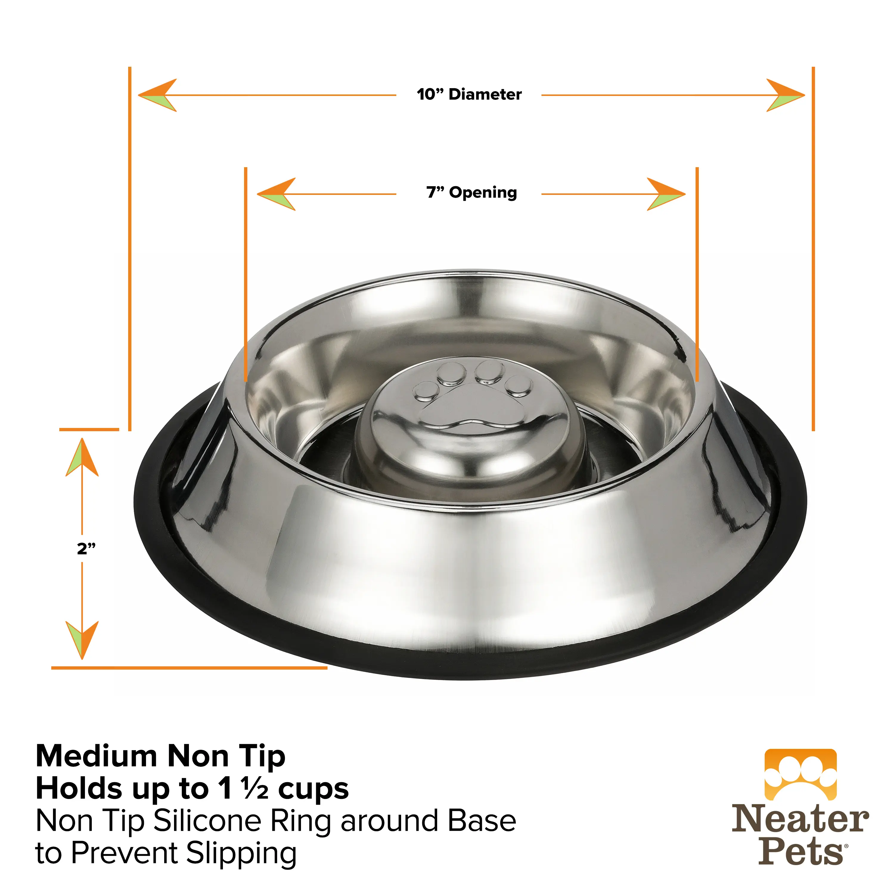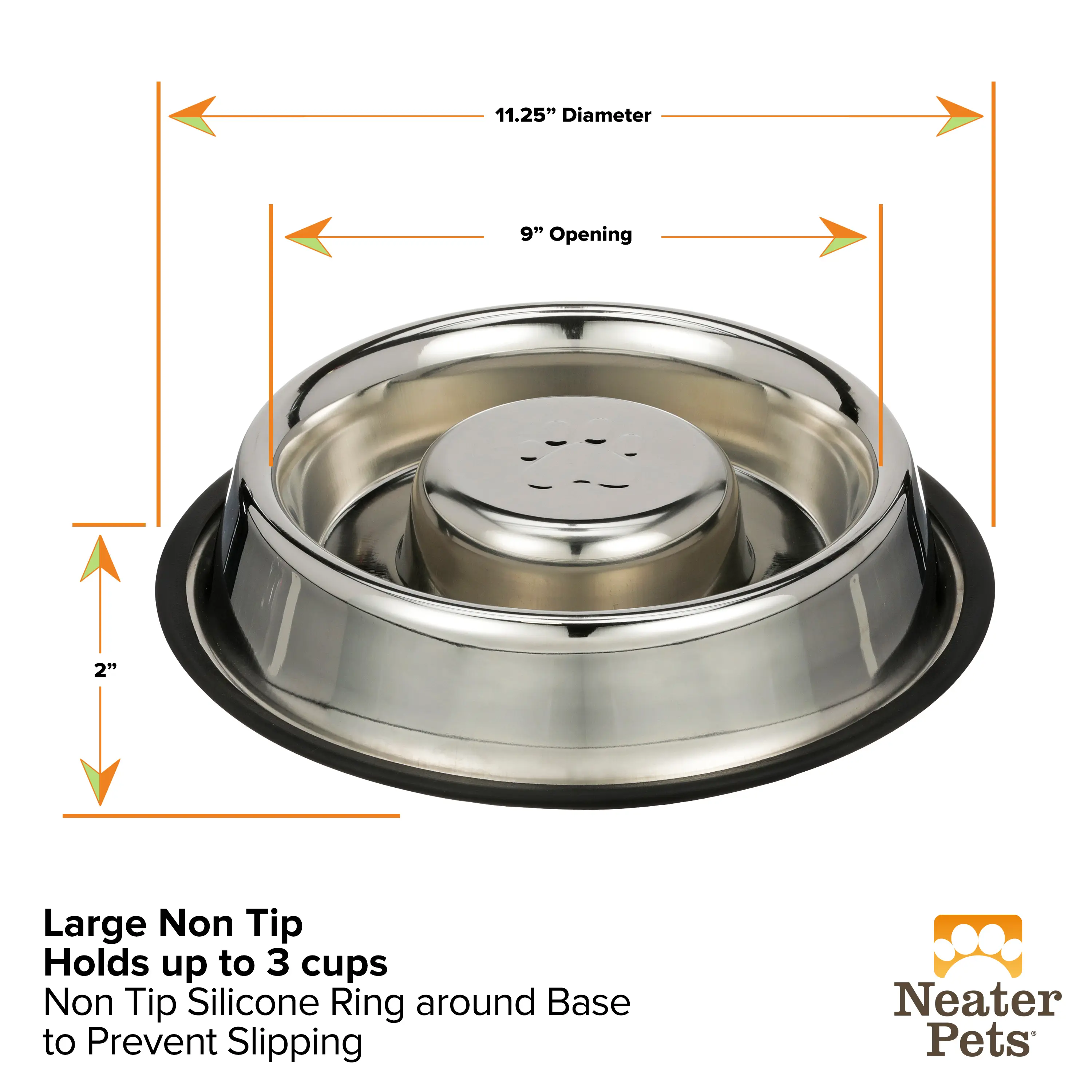 The Neater Pets Stainless Steel Non-Tip Slow Feed Bowl is perfect for preventing your eager eater from gulping down their food or water. It slows rapid eating, reduces vomiting, and helps prevent overeating. This bowl improves digestion and aids in weight management. It features a non-tip design and a removable non-skid rubber base for easy cleaning.