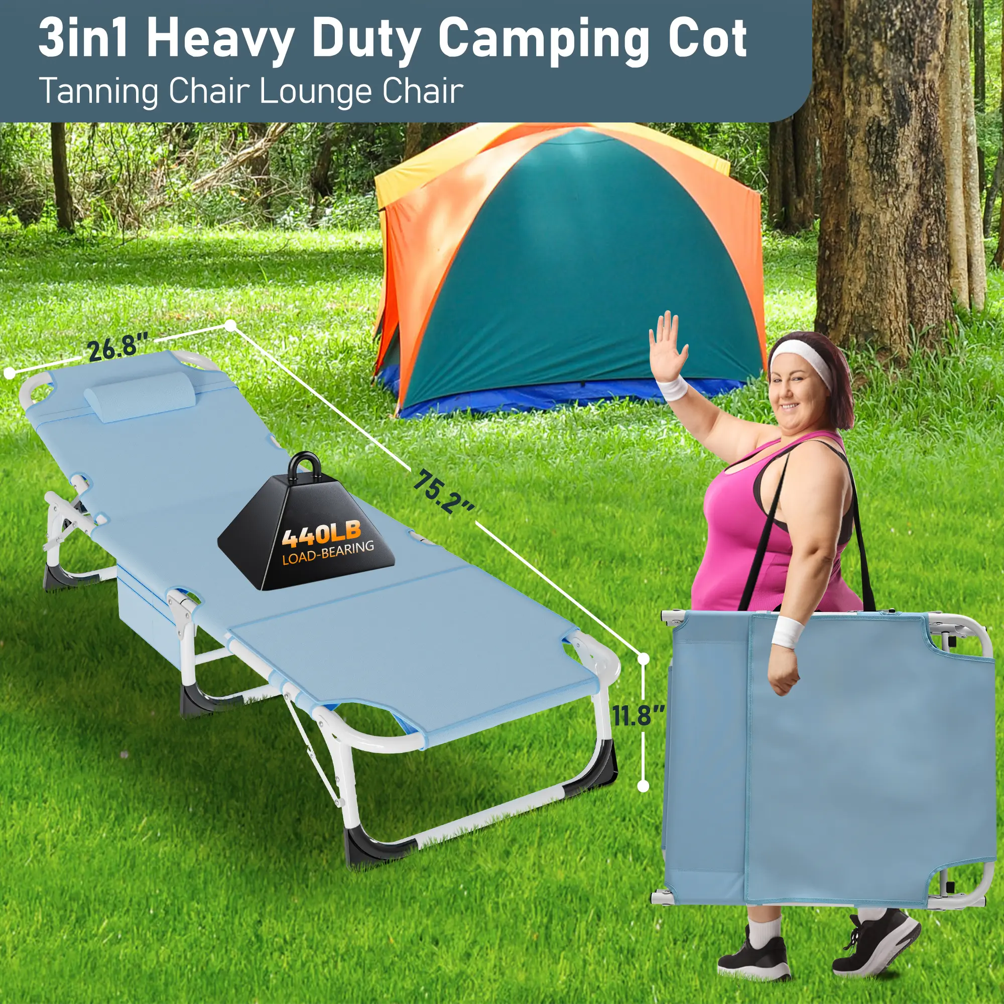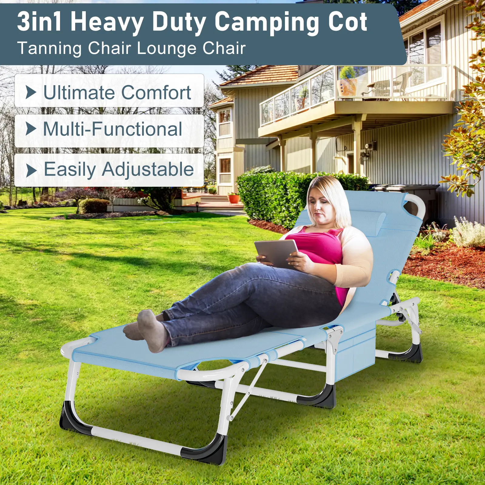 The tri-fold storage design for easy transport and storage. With no tedious assembly steps required, the outdoor chaise lounge greatly saves your time and strength. It's ideal for outdoor and indoor use. You can always enjoy the comfort provided by our chair whether you're camping, fishing, tanning, or chilling in the yard. Or as a snap cot in the office; also a perfect temporary bed when guests visit your home.