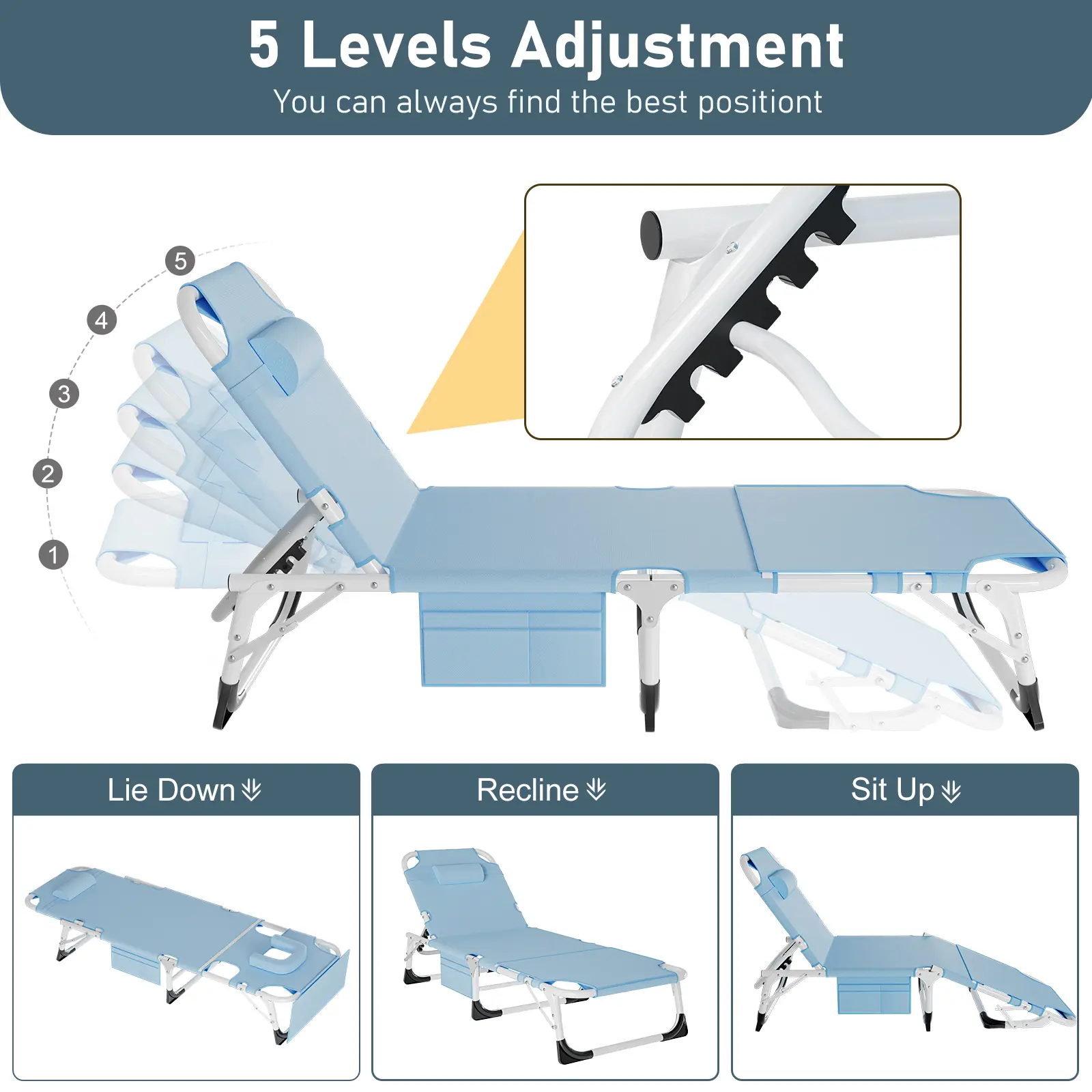 The adjustable lounge chairs have a 5 positions adjustable locking system. You can sit up, recline, or lay flat. Enjoy sunbathing, tanning, reading, relaxing, or taking a nap. The chair is designed for comfort and versatility, making it a must-have for anyone who enjoys multitasking while laying in the sun.