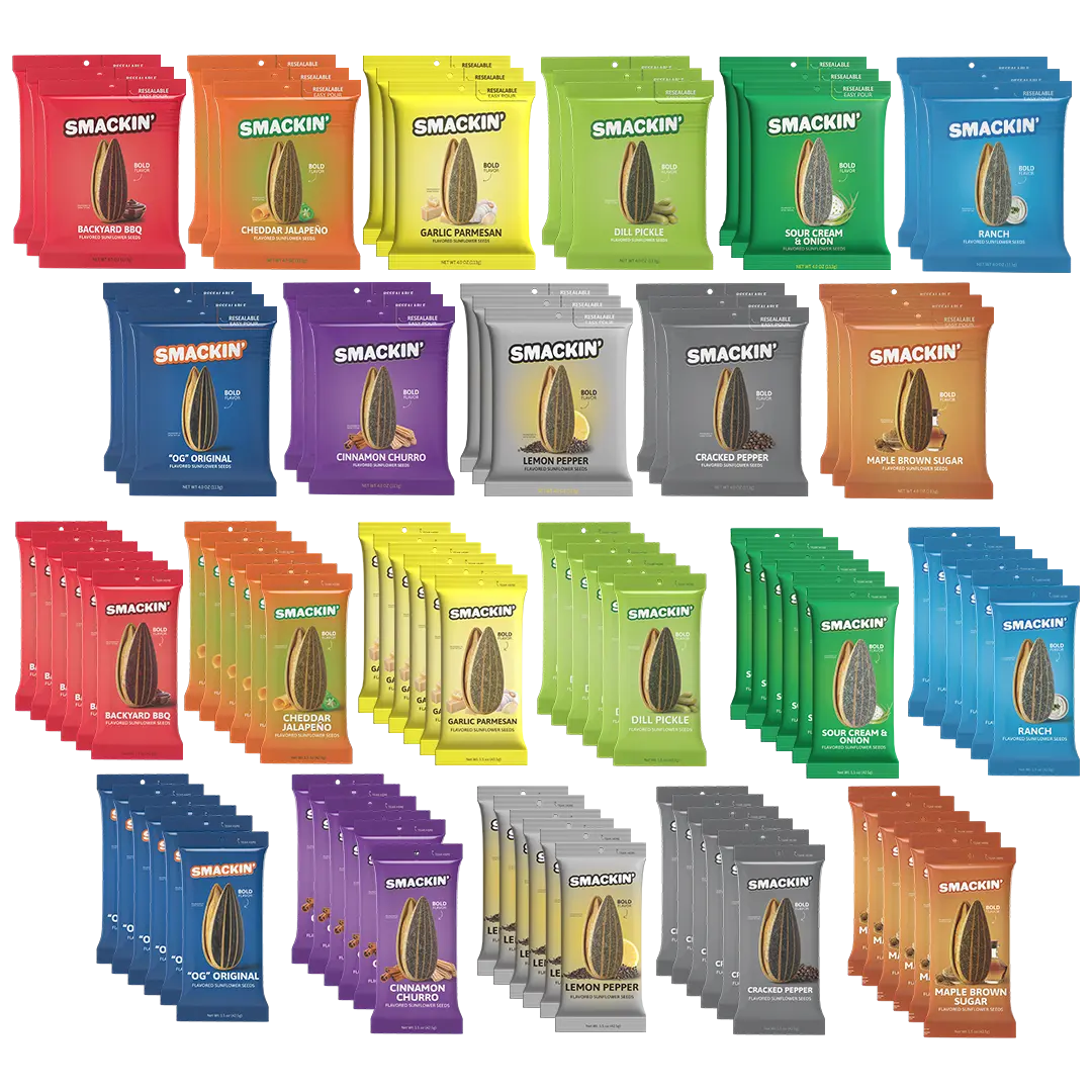 Stock up for the season with 99 total bags of SMACKIN’s bold, crave-worthy sunflower seeds. Whether you’re on the go or snacking at home, this bundle has everything you need to keep the flavor coming all season long.