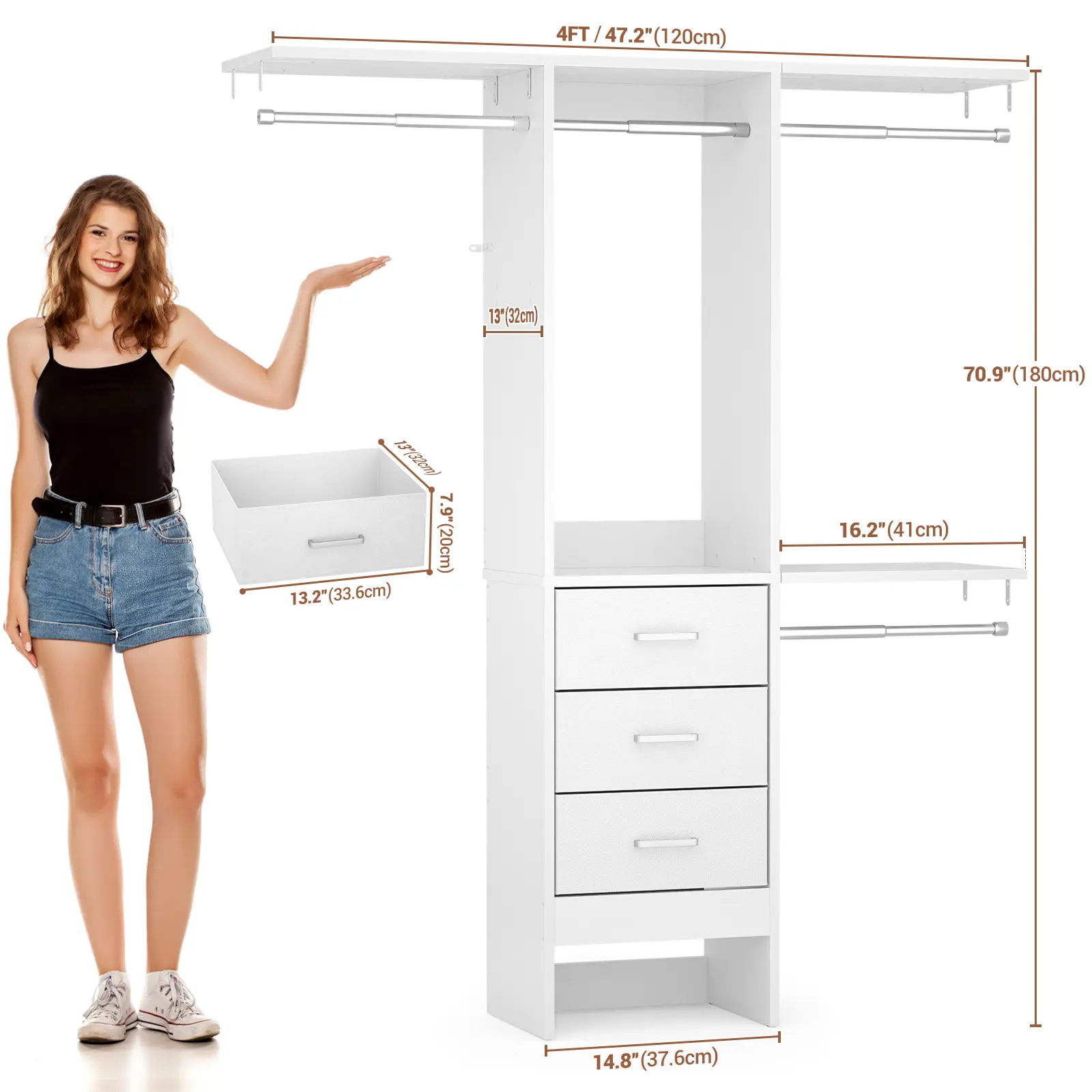 Are you troubled by your small or narrow closet space and you can't find a small closet system to organize your clothes? Our small closet system can meet all your demands, and make your coatroom tidy and organized. This size is 47.2" L x 12.6" W x 71" H. It is perfect for a small space.