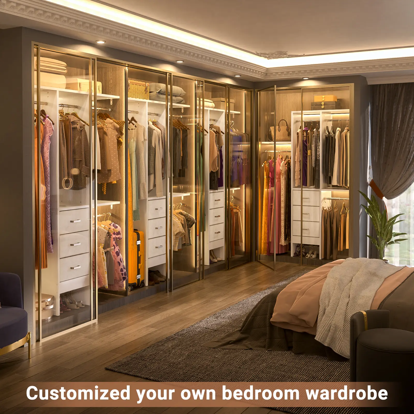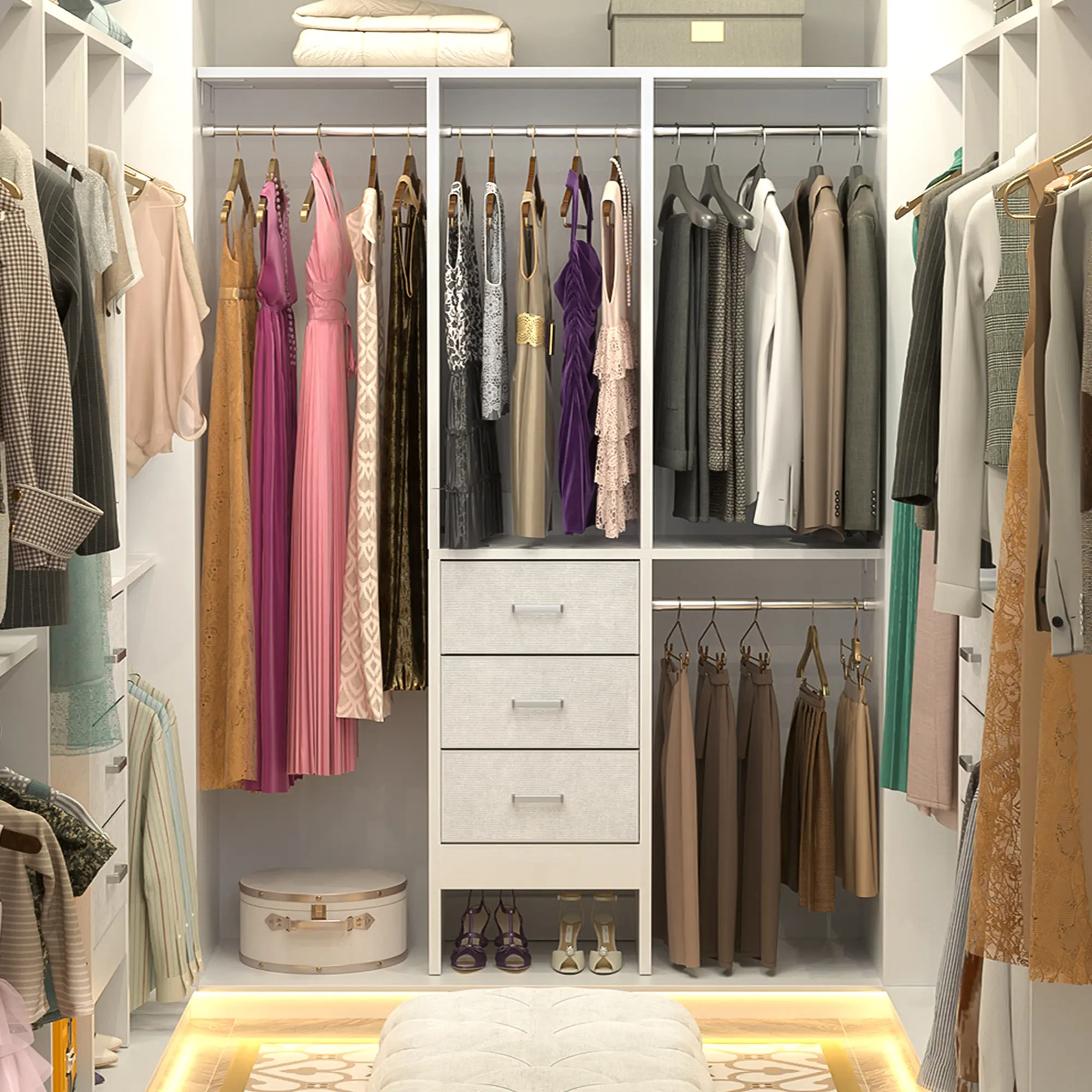 This small cloth garment rack is ease of installation, you just need to install the frame and out the 3 fabric drawers, and then you can get a full set of walk-in bedroom wardrobes.