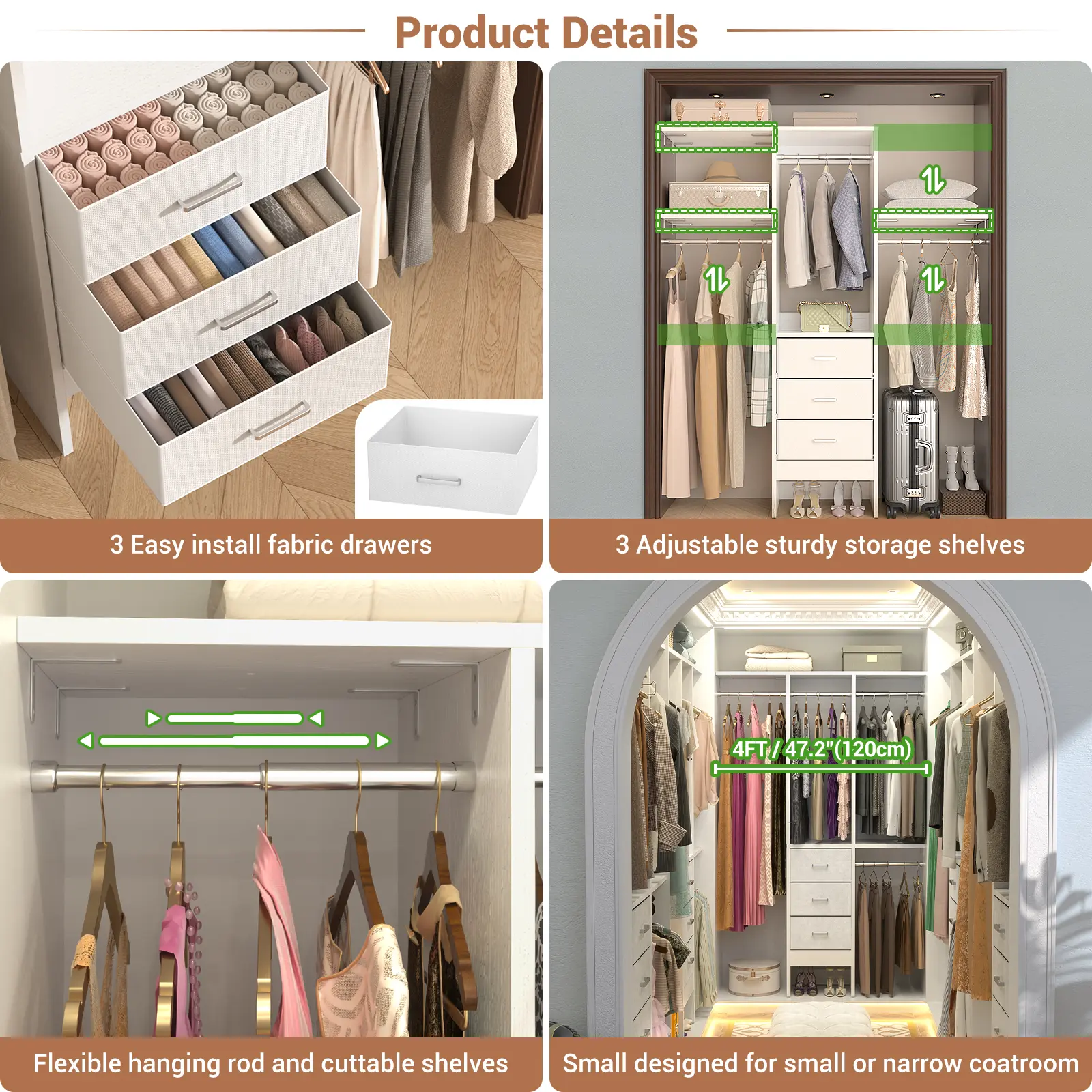This 48 closet has 3 adjustable sturdy storage shelves, so you can hang the cloth on the hanging rods and you can also put clothes on the shelves too. It is a 400+ LBS and 150pcs clothes capacity closet organizer system.