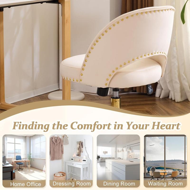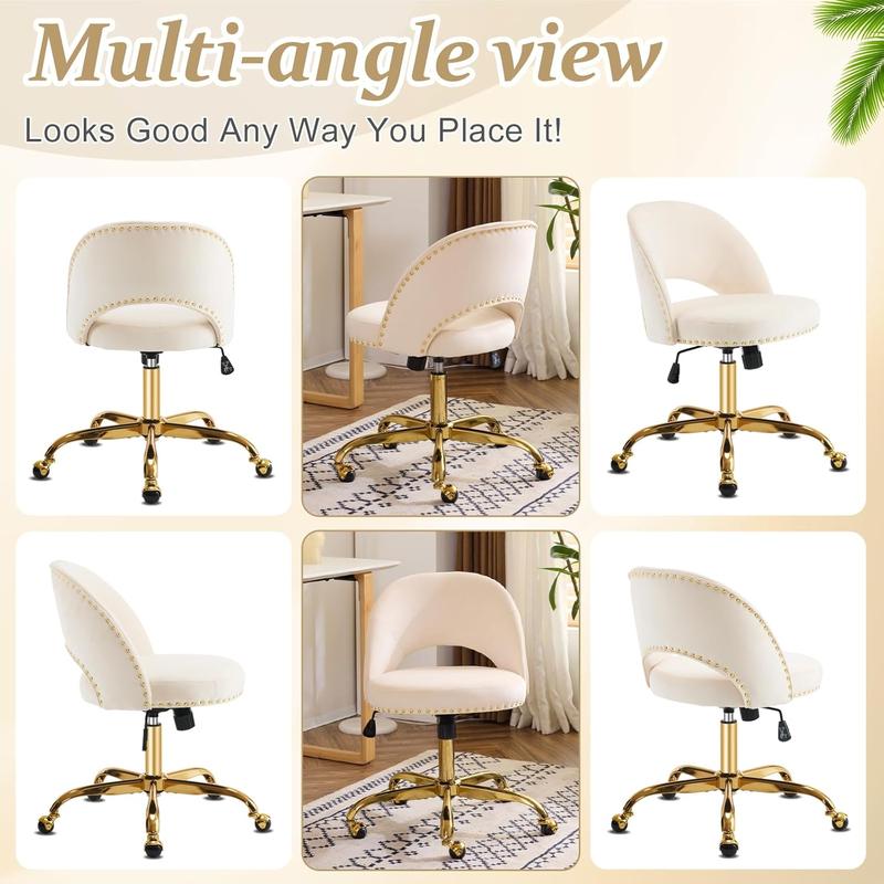Elevate your workspace with the VINGLI Modern Velvet Small Office Chair. This adorable desk chair features wheels for easy mobility. It's perfect for women, girls, and kids. The gold base/studs add a touch of elegance. Ideal for small spaces, it's a comfy armless swivel vanity task chair. Perfect for nail techs in bedrooms.