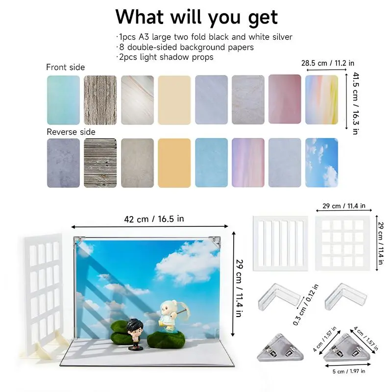 8pcs 16Patterns Small Product Photography Backdrop Kit Photo Backdrop Board for Food Photography - Double-Sided Tabletop Photography Backdrop, 16.54x11.42inch with 2PCS window pane Photography Accessories