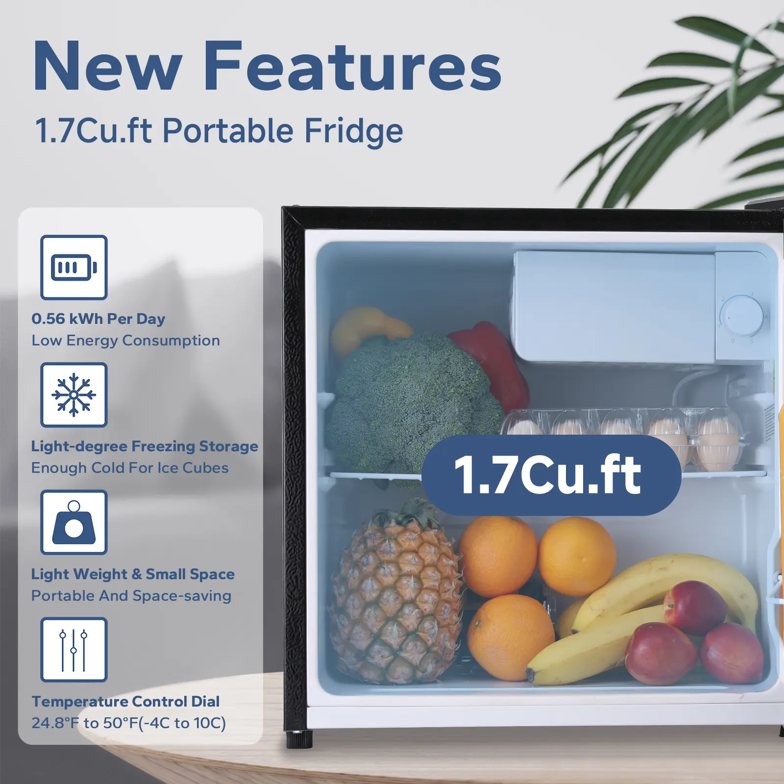 Due to product upgrades, our Black/Silver fridge models have been updated to 1.7 Cu.Ft capacity. Please note that some outer packaging may still show the old 1.6 Cu.Ft label due to a factory error—the actual product inside is the upgraded 1.7 Cu.Ft version.