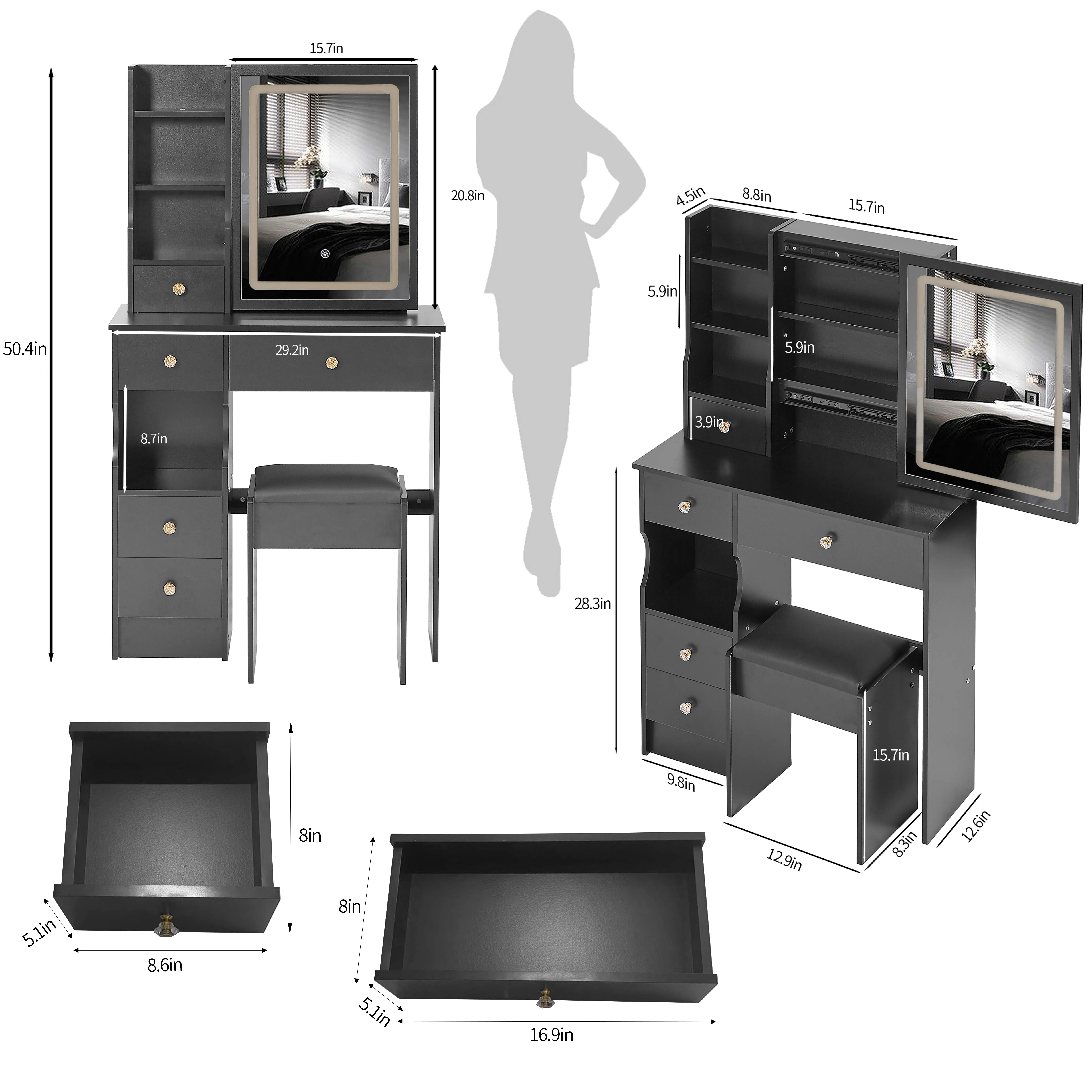 [Designed for small space]: This vanity table set is 29.2" in length and 50.4" in height, designed specifically for small bedrooms. Its advantage is that it takes up less space, so its size is not large. Before purchasing, please note that this is a small-sized dressing table, choose the appropriate size of dressing table according to the user's body shape and the size of the space where the dressing table is placed.