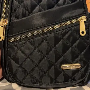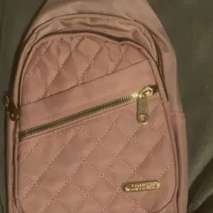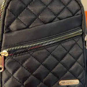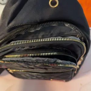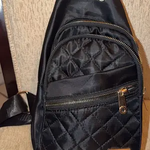Four spacious compartments. Nice clean zippers and tracks. Strong wide adjustable strap. Elegant design and the front is quilted.