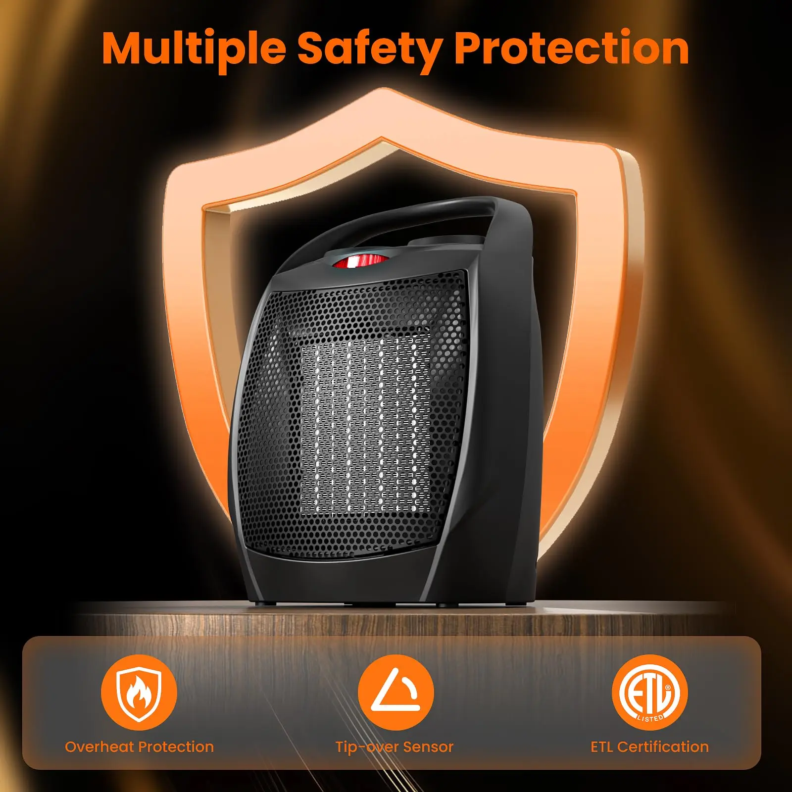 ● TIP-OVER PROTECTION AND OVERHEAT PROTECTION: The small space heater for indoor use quipped with a switch to switch off the machine if it is over returned, the design of overheat protection will switch off the appliance automatically in case of severe overheating.