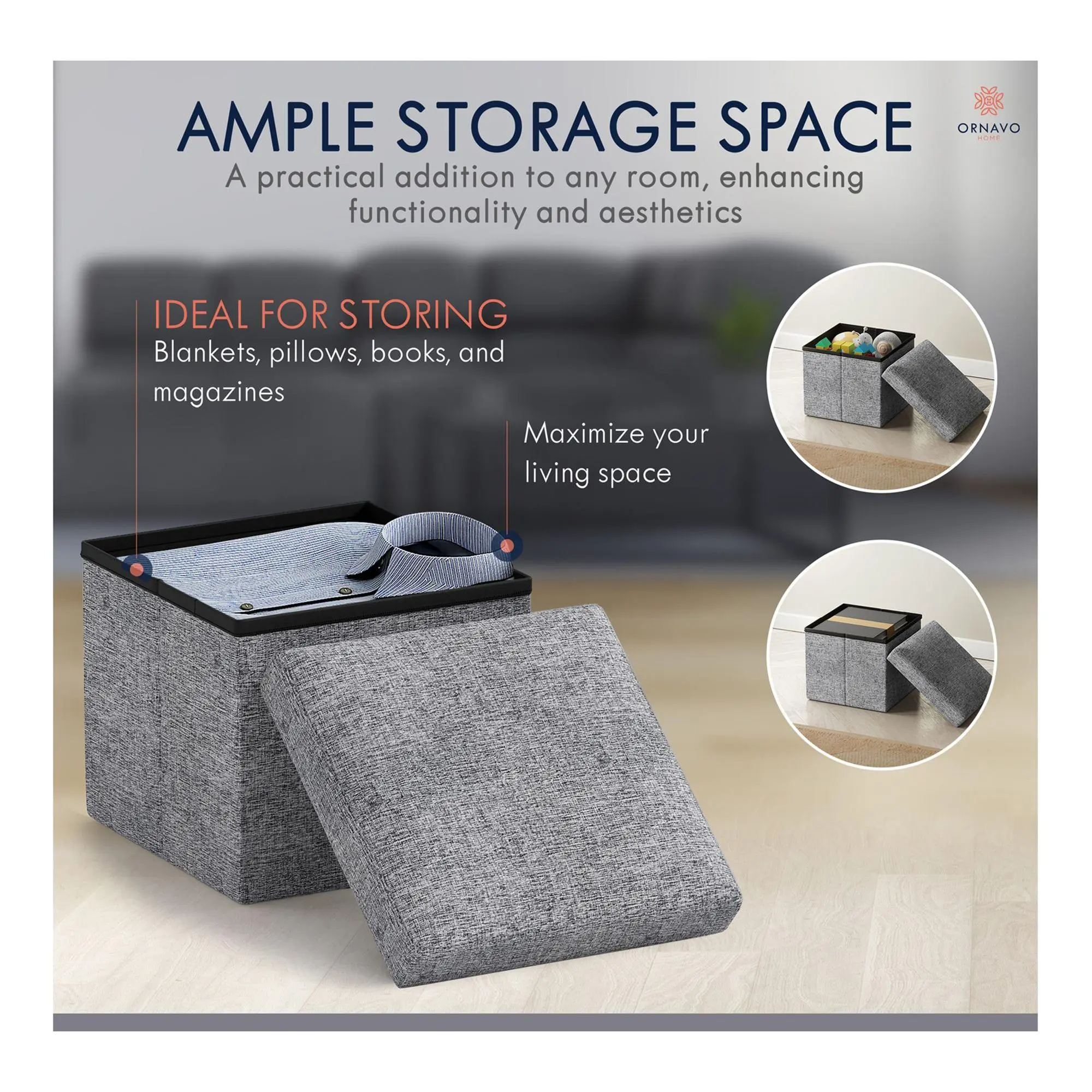 Transform your living space with this storage ottoman, a versatile addition that marries function with style. This ottoman, crafted with sleek linen upholstery, not only offers an extra seat but also provides ample storage for media accessories, books, and magazines, keeping your area tidy and stylish. Ideal for the living room, family room, or den, its contemporary design seamlessly integrates with various decor styles, making it a lasting piece for your home. From Ornavo Home.