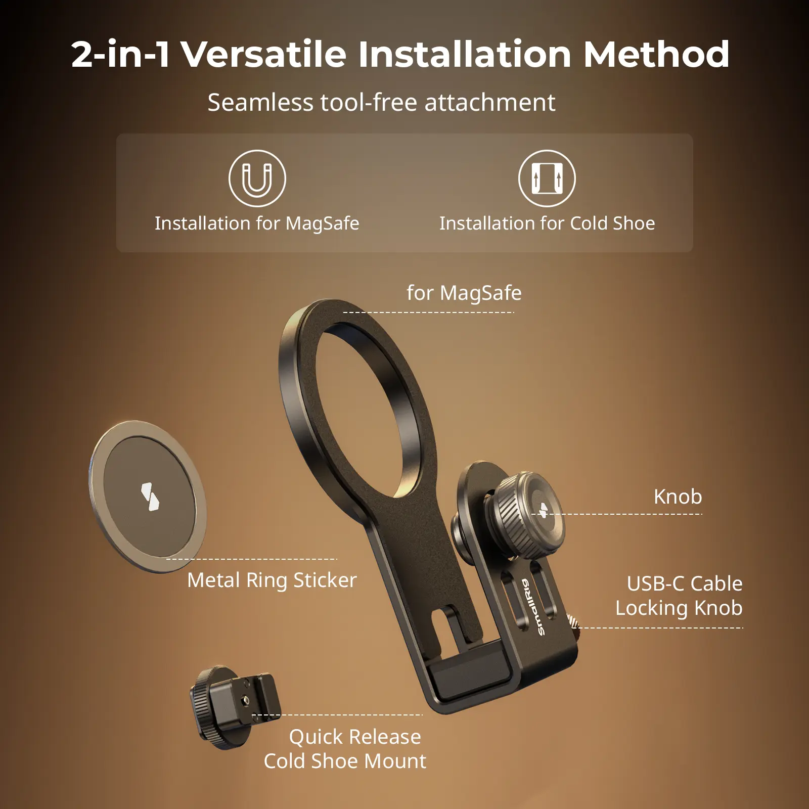 ·【2-in-1 Installation Method】The SSD Mount Bracket adopts a 2-in-1 installation method of cold shoe mount and for Magsafe, which can be used in multiple scenarios. The included detachable cold shoe adapter can be quickly installed at the bottom of the SSD bracket by sliding in, allowing the bracket to be installed on a phone cage / camera cage or other cold shoe adapters. You can also remove the cold shoe mount and attach it to the back of a phone with for MagSafe function through for MagSafe magnet.