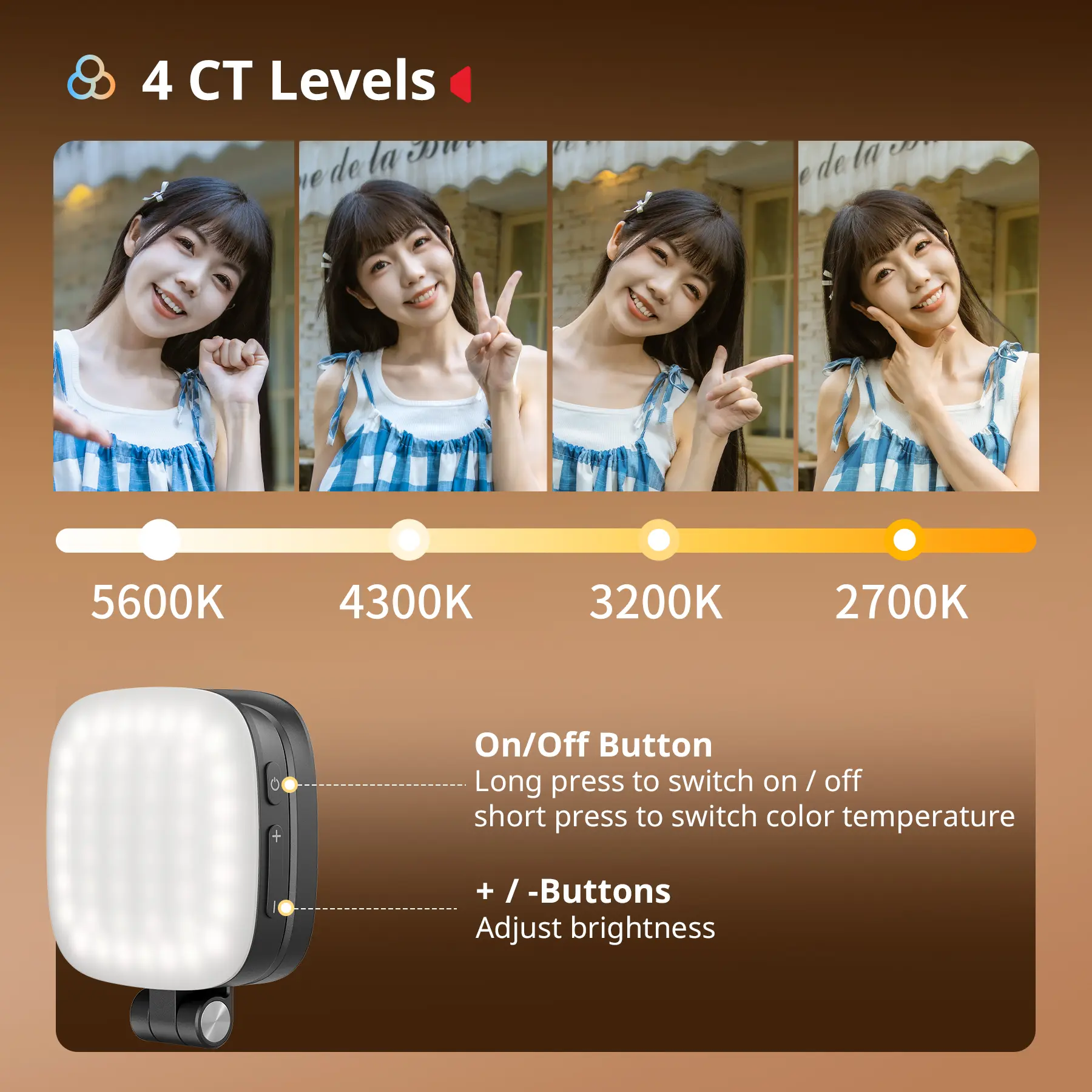Buena mini luz: 2700–5600K, 5 niveles y CRI 90+. Pero ojo: el “espejo” es de maquillaje normal, NO sirve para ver el encuadre con cámara trasera. Además no funciona mientras carga. Útil como luz, engañosa si la compras por el espejo.