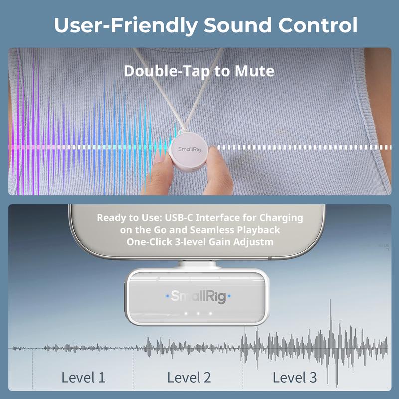 ·User-Friendly Sound Control: It features a 3-level gain adjustment and convenient mobile charging support on the receiver. Additionally, it has a double-tap mute function on the transmitter. These features make it perfect for mobile filming and live streaming