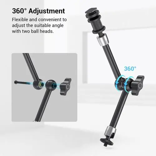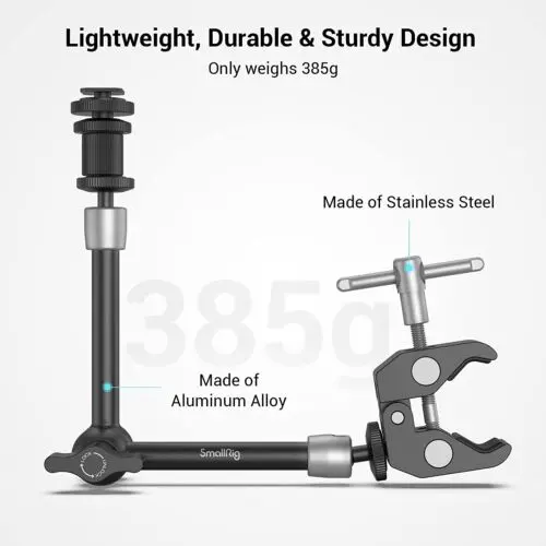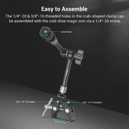 Convenient Combination: SmallRig Super Clamp & Magic Arm (11'') with Cold Shoe 3726 consists of crab-shaped clamp and magic arm (11"). Maximum / minimum open width is 54mm / 15 mm and Maximum load is 1.5 kg. The double ball heads are 360 degrees adjustable.Multiple Mounting Points: The magic arm has a 1/4"-20 screw on one end and a cold shoe on the other. The super clamp has a 1/4"-20 and 3/8"-16 thread.Extended Use Scenarios: You can mount accessories such as cages, LED lights, microphones or monitors. The magic arm and clamp can be quickly connected with cameras, monitors, lights and other equipment with pipes, tables, bicycle bars, etc..Durable Material: The super clamp and magic arm are made of aluminum alloy and stainless steel to increase strength and durability.Anti-scratch Design: The clamp and the magic arm are equipped with rubber pads to prevent scratching.