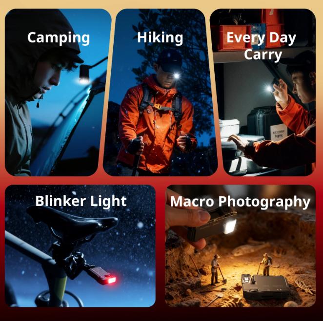 · Ultra-Compact & Lightweight: About the size of a Zippo lighter and weighing only 54.0g (1.9 oz), this pocket-friendly flashlight is the perfect Everyday Carry (EDC) companion · 5-in-1 Multi-Functional Design: Features a rotatable light head, magnetic base, back clip, 1/4"-20 mounting hole, and an included diffuser for versatile use · Powerful & Long-Lasting: Delivers 400 lumens with an 82m (269ft) throw, providing 50 minutes of runtime in high mode and up to 65 hours in low mode · Adaptive Lighting: RGB effects + stepless 6500K brightness adjustment + IP65 waterproofing, making it suitable for diverse scenarios
