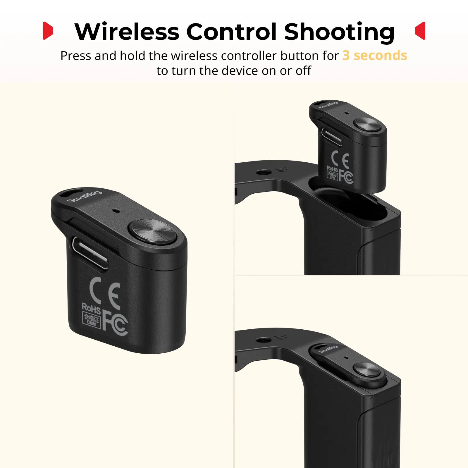 ·Wireless Control Shooting: Equipped with a detachable SmallRig WR-06 wireless controller, press and hold the wireless controller button for 3 seconds to turn the device on or off, and easily control the phone to shoot or stop shooting.
