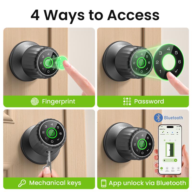 GHome Smart 4-in-1 Keyless Entry Door Knob with Biometric Fingerprint, Keypad, App and Bluetooth Control, Rechargeable Battery with Removable Charging Design for Home, Bedroom, and Apartment