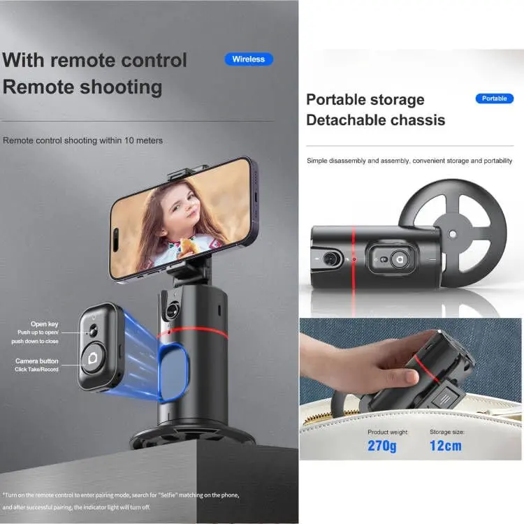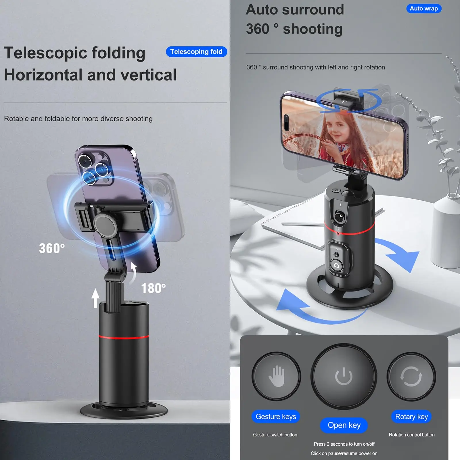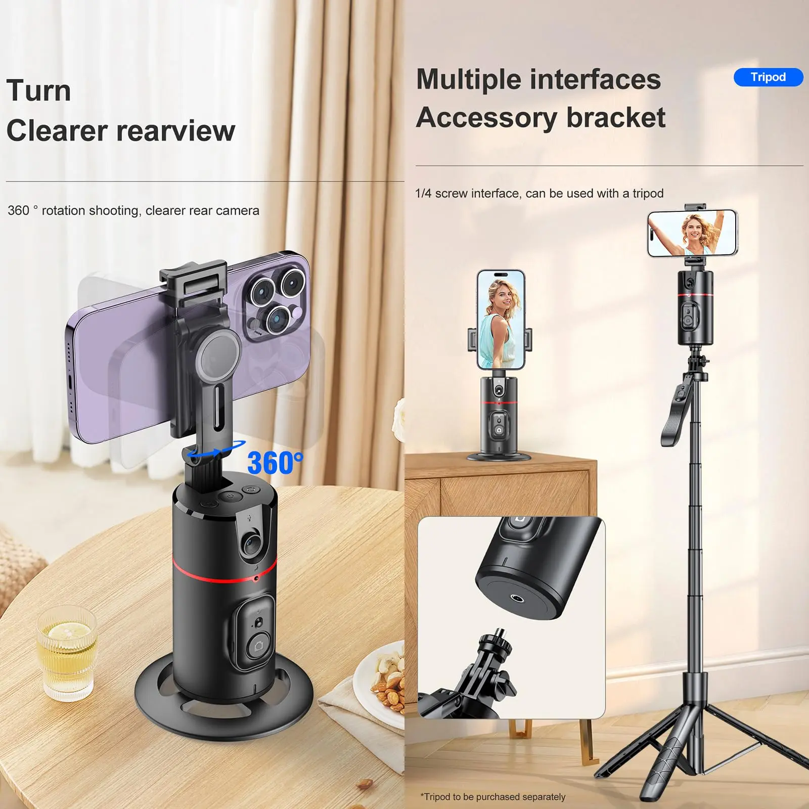 Equipped with a built-in camera and advanced AI recognition, this 360° rotating tripod automatically follows faces and body movements for smooth, hands-free shooting.