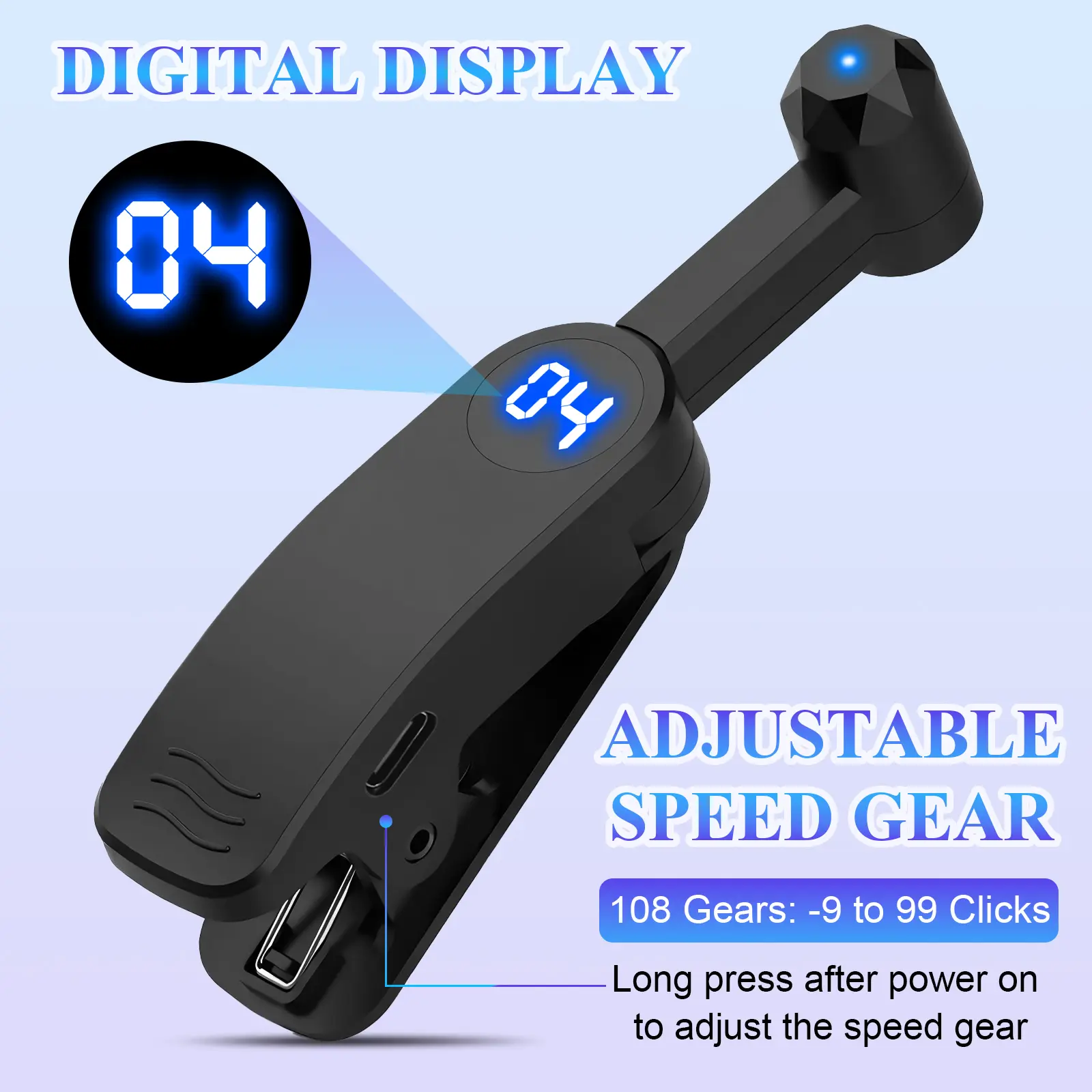 How to Use: Press the power button to enter startup mode — numbers will appear on the screen. Then press the “left” button to begin clicking, indicated by a flashing blue light. While in startup mode, hold the power button to adjust the clicking frequency.
