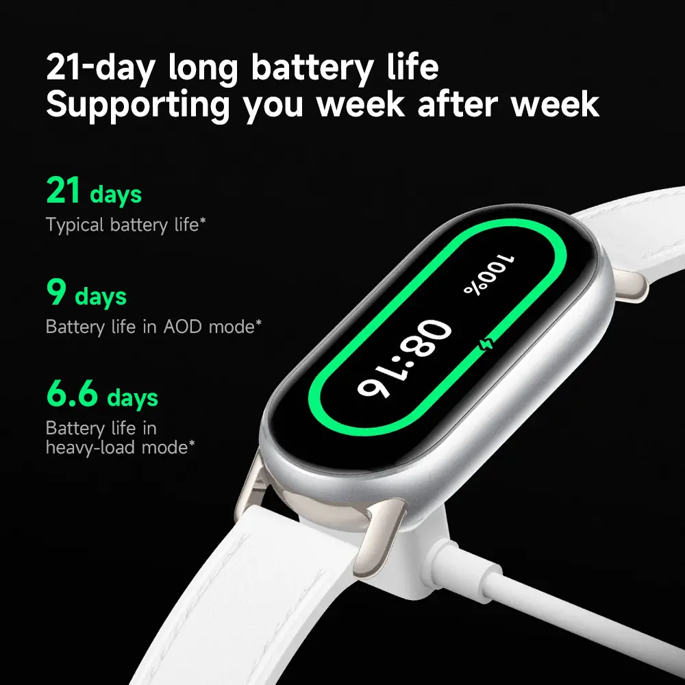 Crafted with an aluminum alloy sandblasted frame available in five stunning colors, the Smart Band 9 is paired with multi-material wrist straps that allow for one-click quick disassembly and effortless personalization.