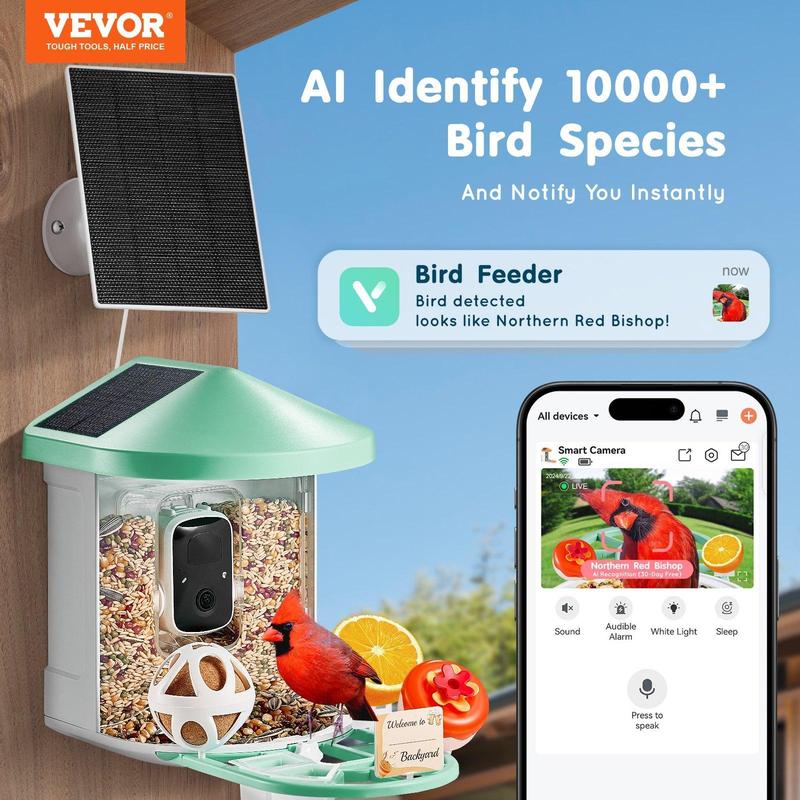 5. VEVOR Smart Bird Feeder Camera with 3 Solar Panels, Solar Powered Wireless Camera Bird Feeder with Live Video, AI Identify, Auto Detect & Instant Notify, and 2K Full HD, Ideal Gift for Bird Lover