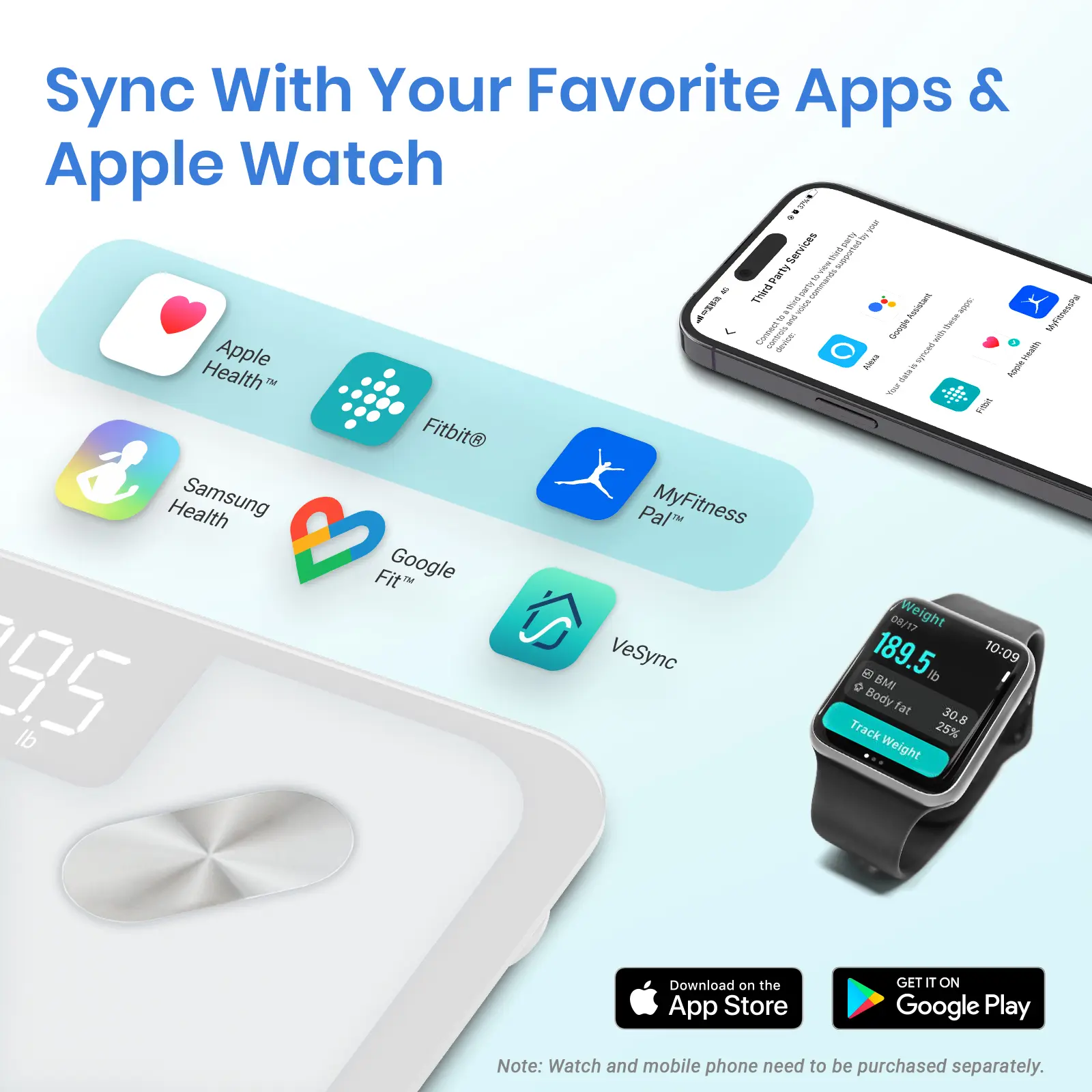 ·Use with Ease: Seamlessly integrate our scale into your fitness routine. Compatible with APPLE WATCH and syncs data with popular fitness apps like Apple Health, Samsung Health, Google Fit, FitBit, and MyFitnessPal. Supports unlimited users for convenience