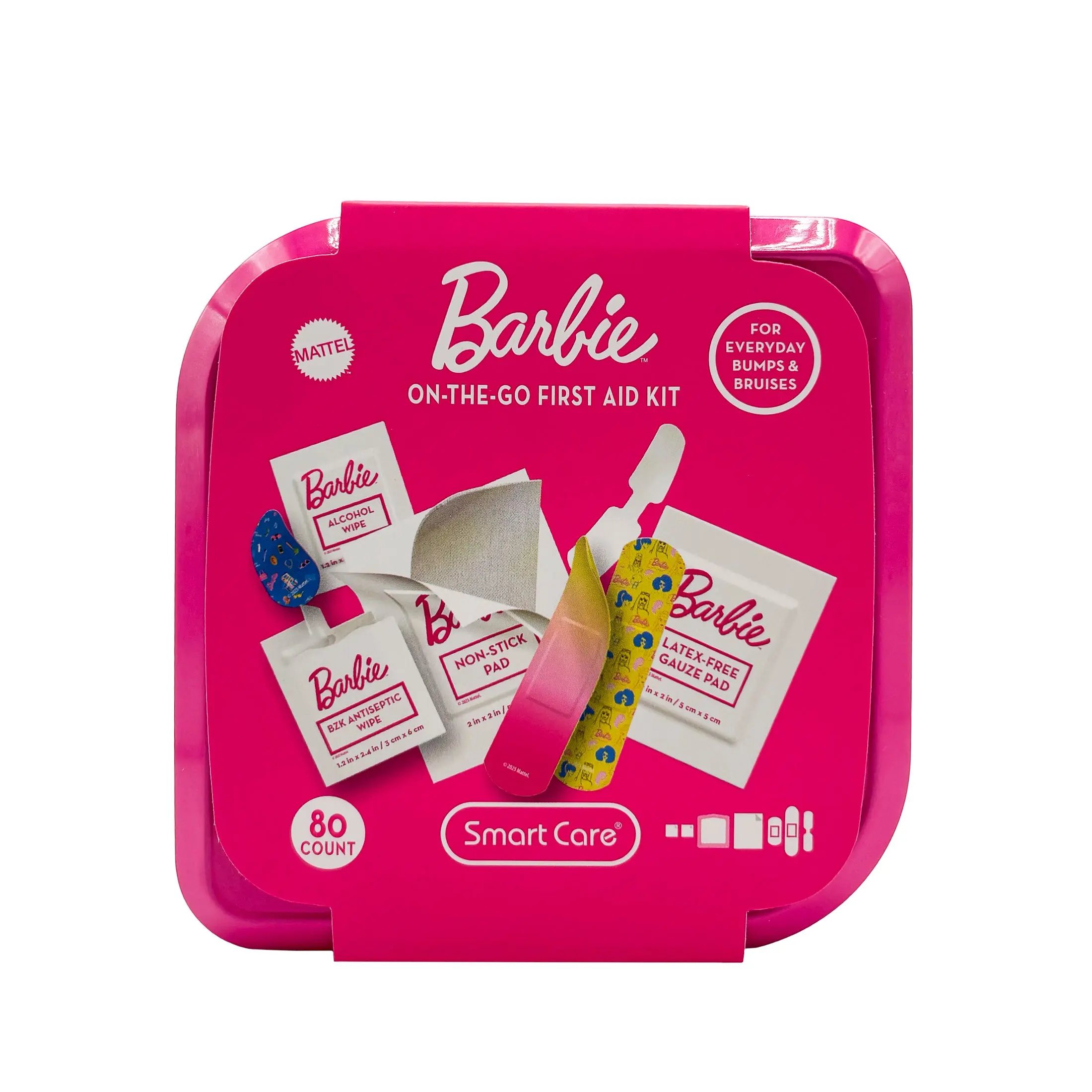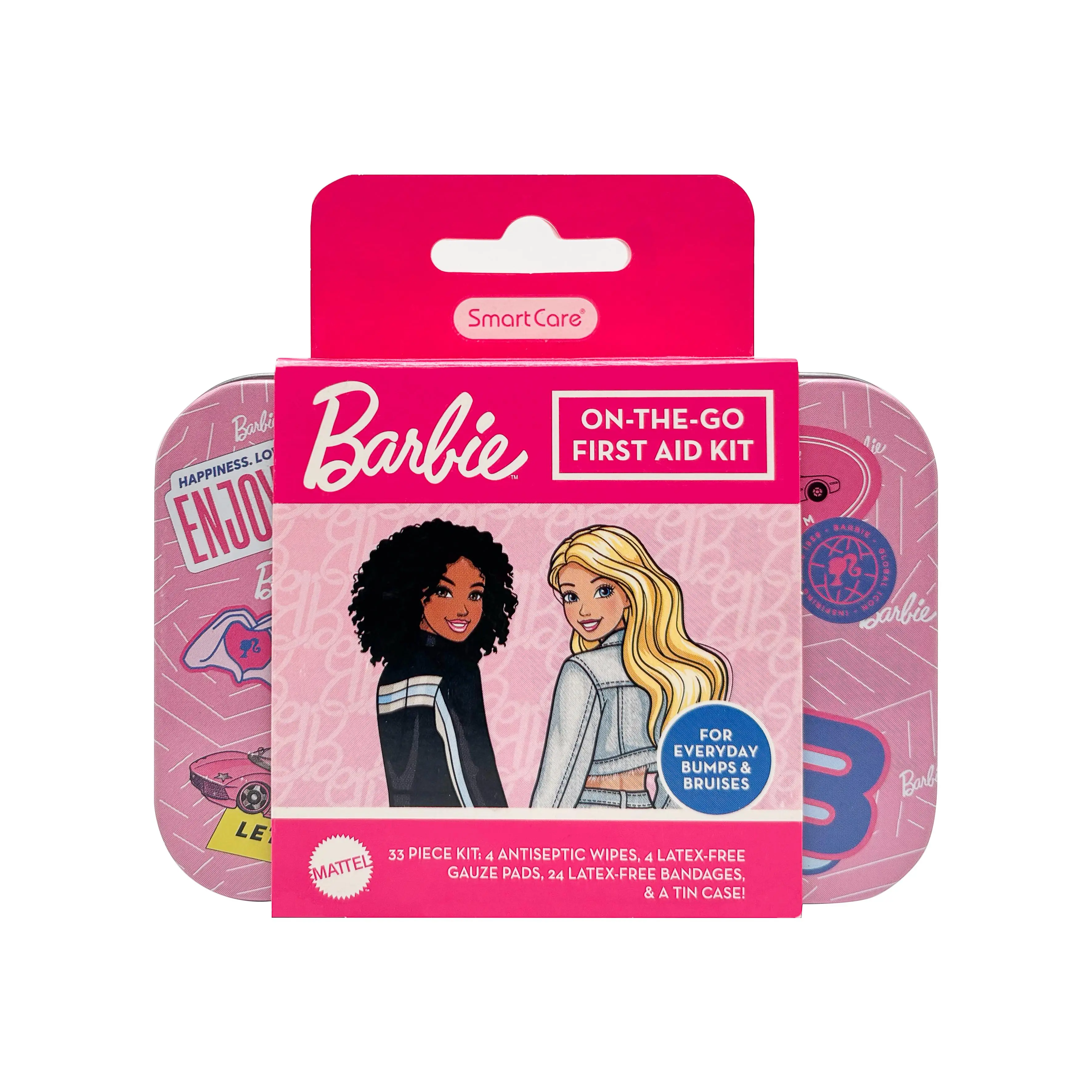 Smart Care Barbie First Aid Kits keep you covered... literally! Each kit includes bandages, antiseptic wipes, and latex-free gauze pads. With a convenient storage tin, you're covered at home and on-the-go. Use the antiseptic wipes to clean minor cuts and scrapes! The assorted bandages feature two fun Barbie designs to keep your skin protected.