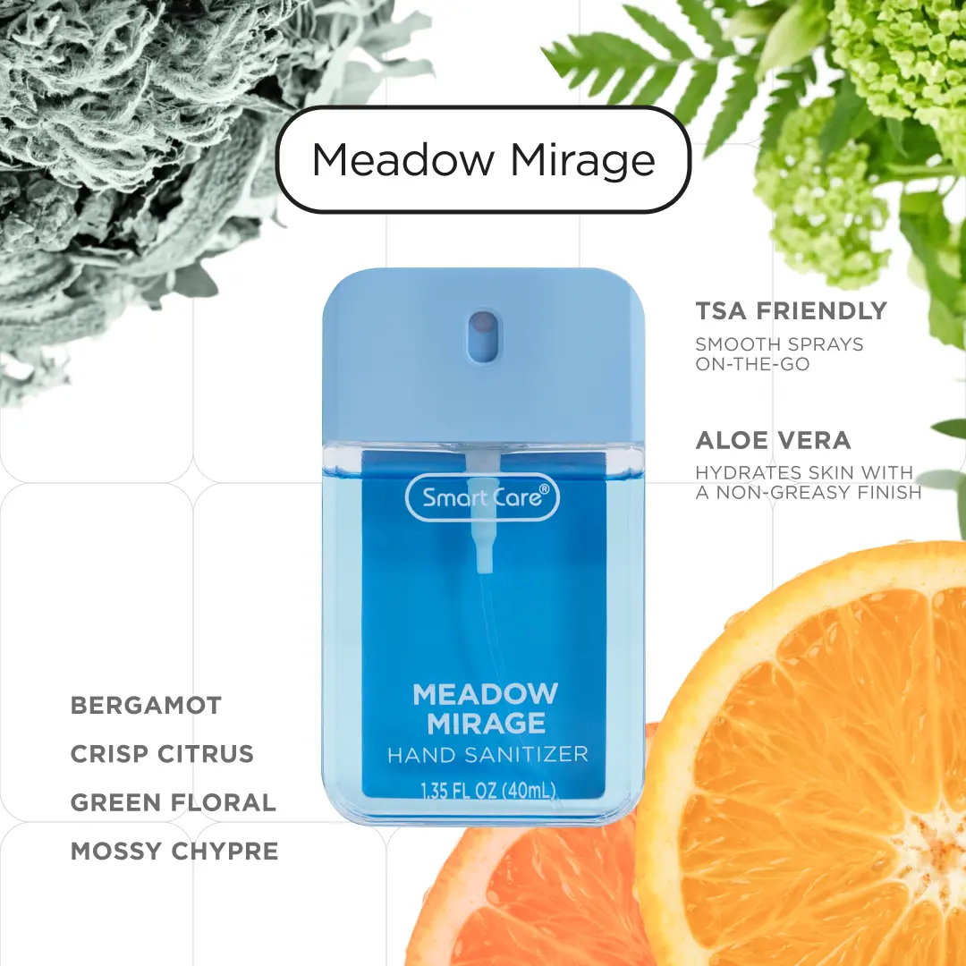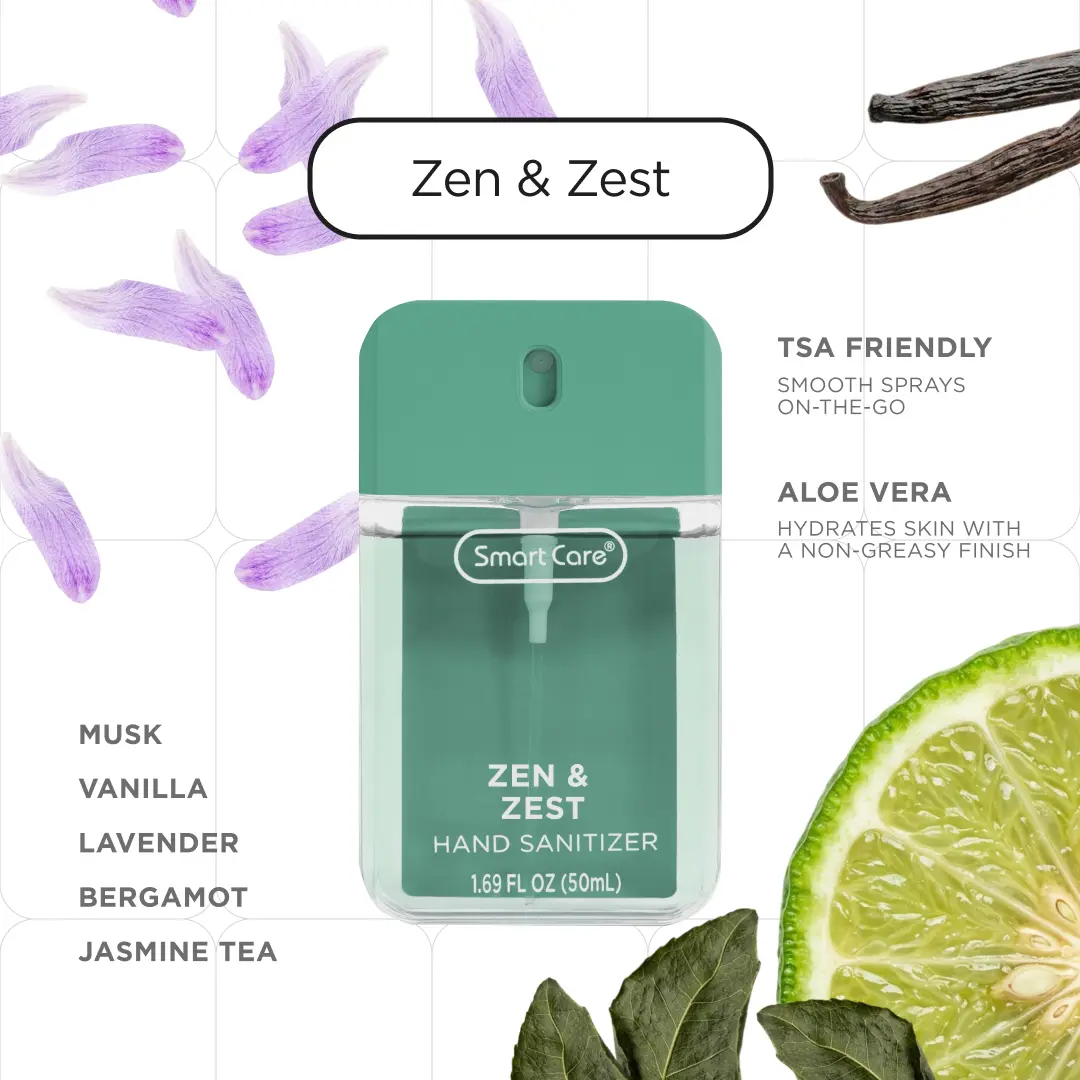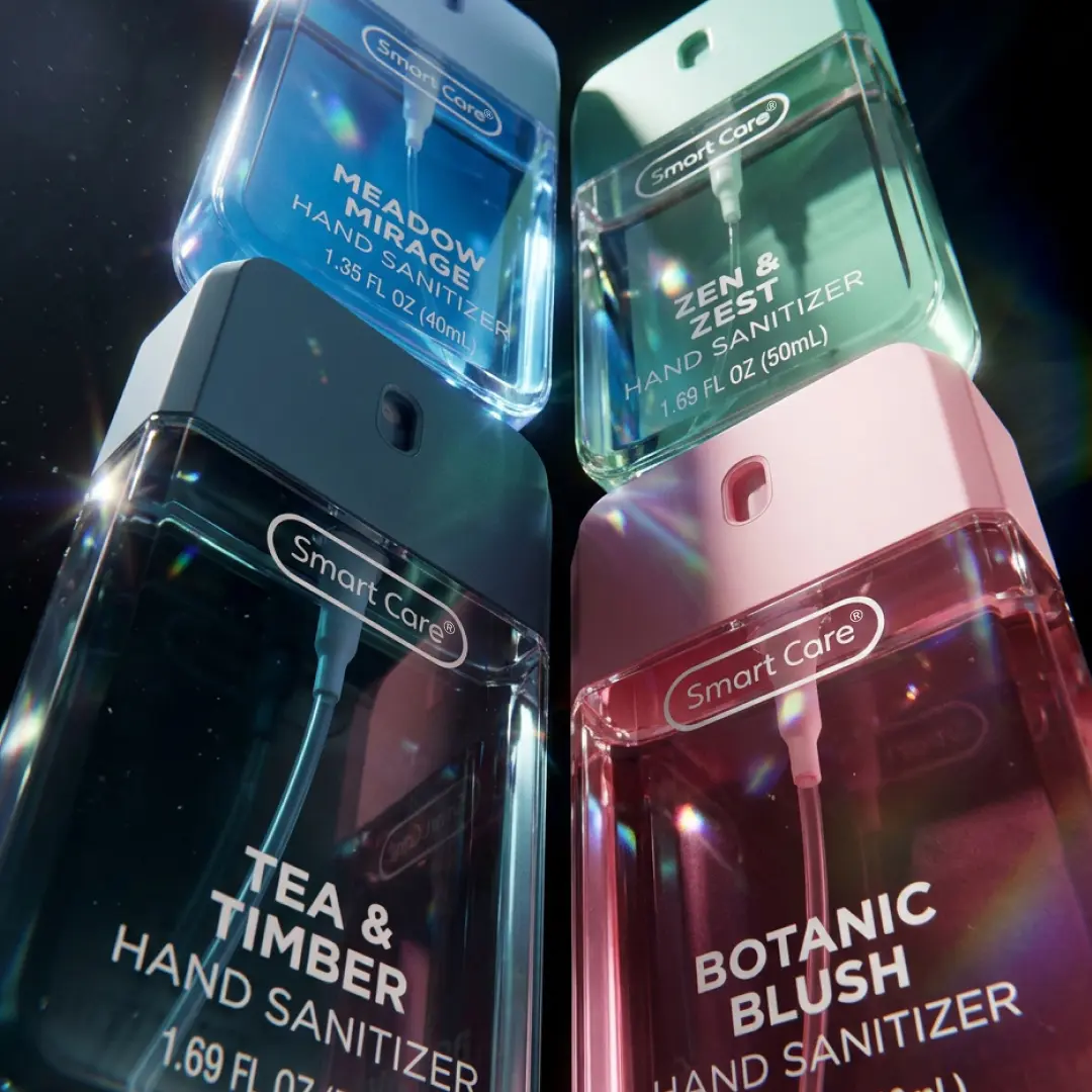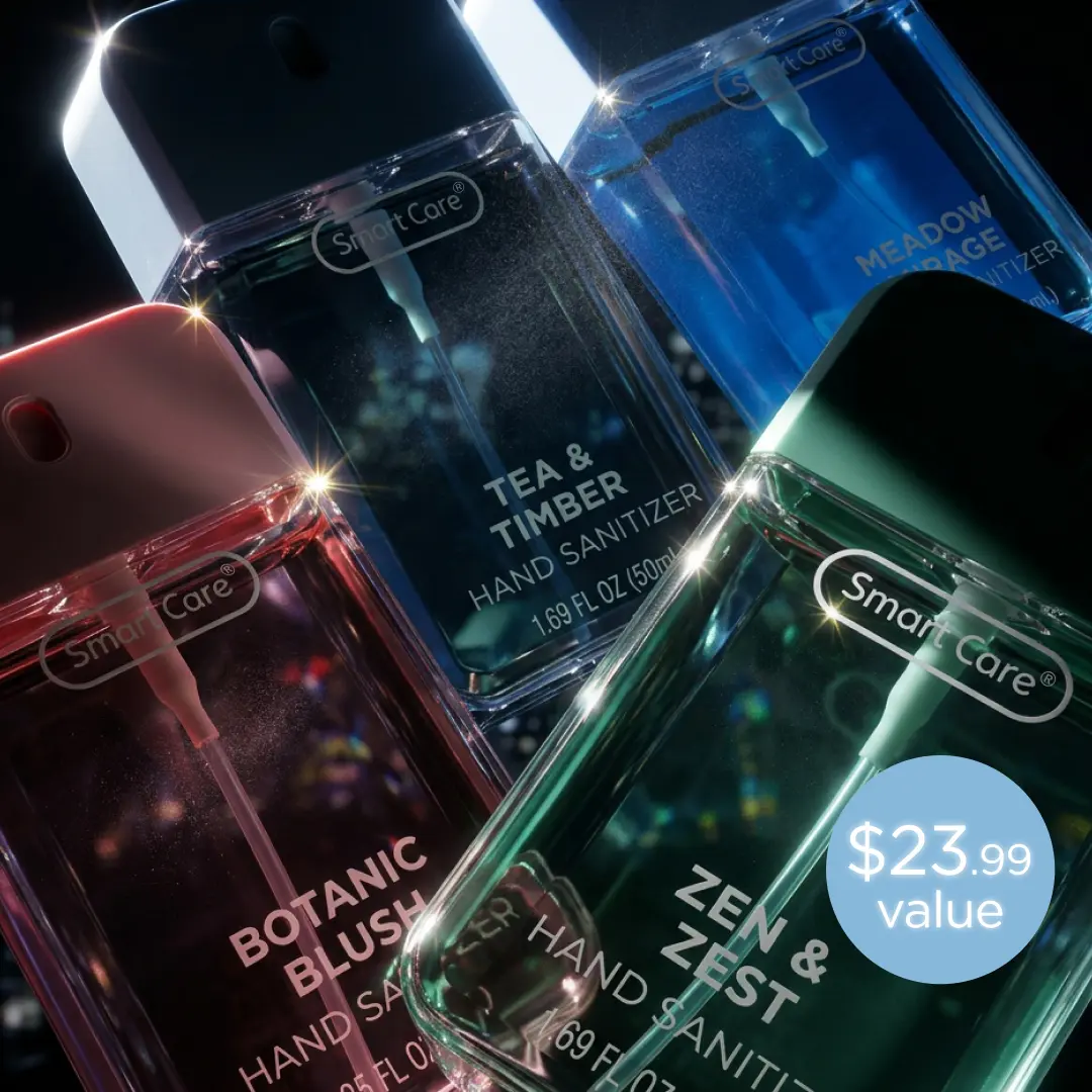 Meet the Smart Care Luxury Hand Sanitizer Spray, your new everyday essential. This compact 1.35 ounce spray is perfect for staying germ free wherever you are. The easy to use spray nozzle delivers a non sticky, even application with every spritz, killing 99% of germs in seconds. This Fresh Bundle includes Botanic Blush, Tea & Timber, Zen & Zest, and Mirage Meadow, perfect for anyone who loves clean, crisp, and refreshing fragrances. Enjoy these uplifting scents all in one set.