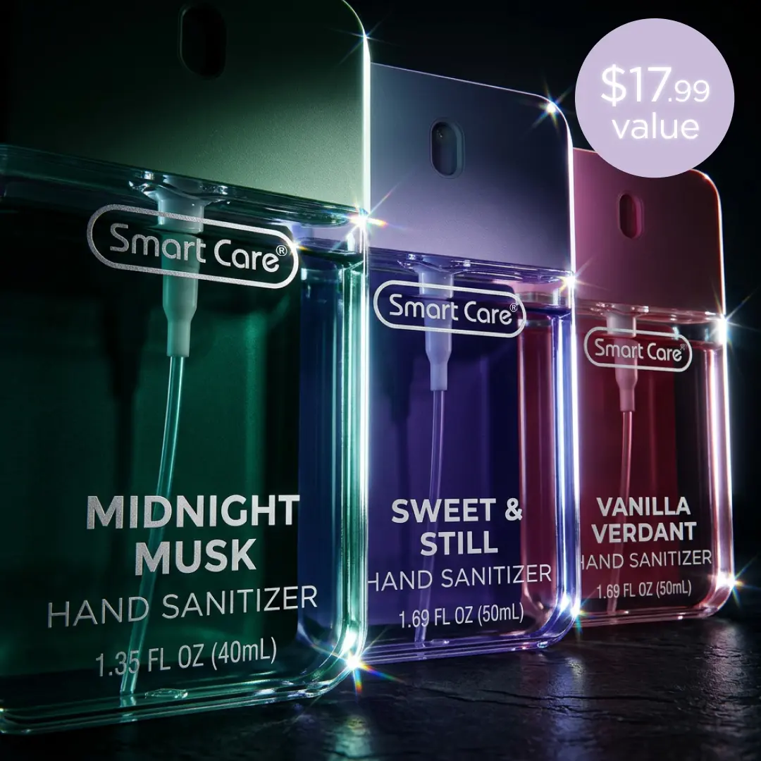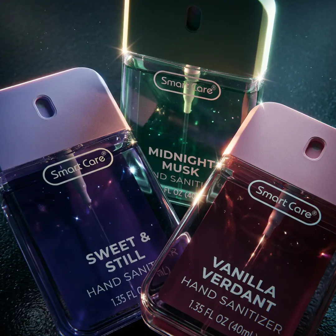 Meet the Smart Care Luxury Hand Sanitizer Spray, your new everyday essential. This compact 1.35 ounce spray is perfect for staying germ free wherever you are. The easy to use spray nozzle delivers a non sticky, even application with every spritz, killing 99% of germs in seconds. This Pour Femme Bundle includes Midnight Musk, Sweet & Still, and Vanilla Verdant, thoughtfully curated for those who love soft, feminine leaning fragrances. Your go to set for keeping your hands fresh, clean, and beautifully scented.