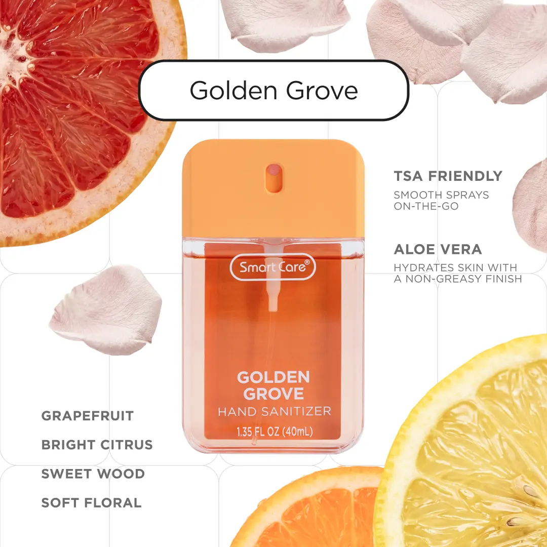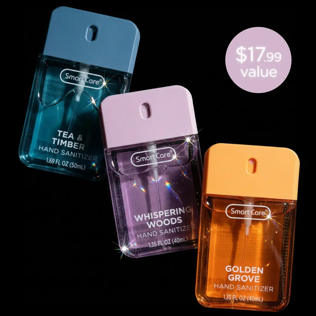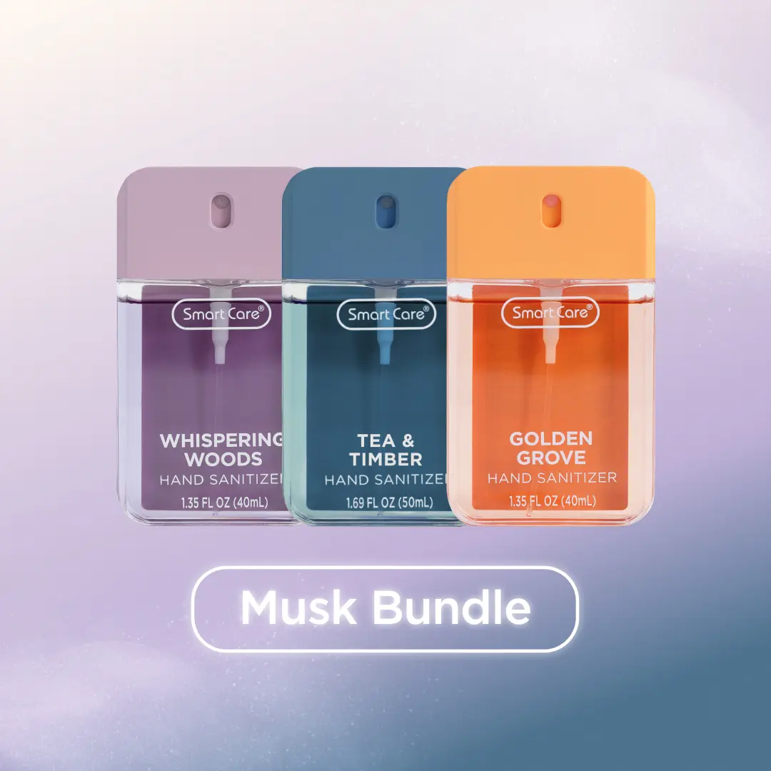 Meet the Smart Care Luxury Hand Sanitizer Spray, your new everyday essential. This compact 1.35 ounce spray is perfect for staying germ free wherever you are. The easy to use spray nozzle delivers a non sticky, even application with every spritz, killing 99% of germs in seconds. This Musk Bundle includes Whispering Woods, Tea & Timber, and Golden Grove, crafted for those who prefer warm, smooth, musky inspired fragrances. Enjoy a more elevated scent experience in one set.