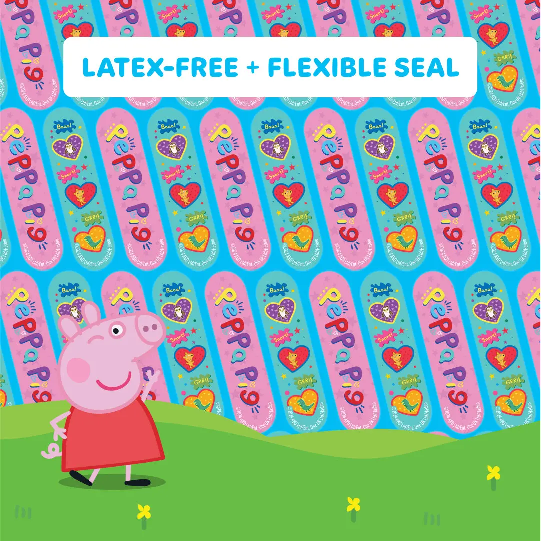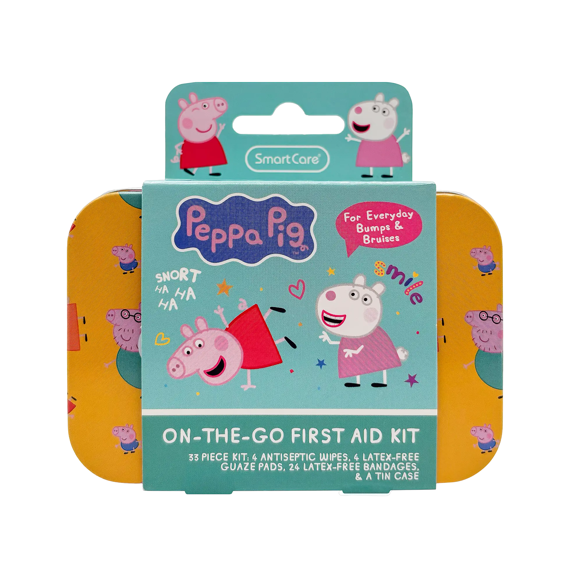 Smart Care Peppa Pig First Aid Kits keep you covered... literally! Each kit includes 24 bandages, 4 antiseptic wipes, and 4 latex-free gauze pads. With a convenient storage tin, you're covered at home and on-the-go. Use the antiseptic wipes to clean minor cuts and scrapes! The assorted bandages feature two fun Peppa Pig designs to keep your skin protected.