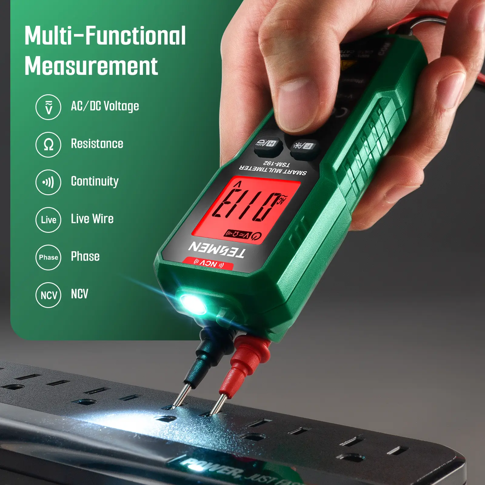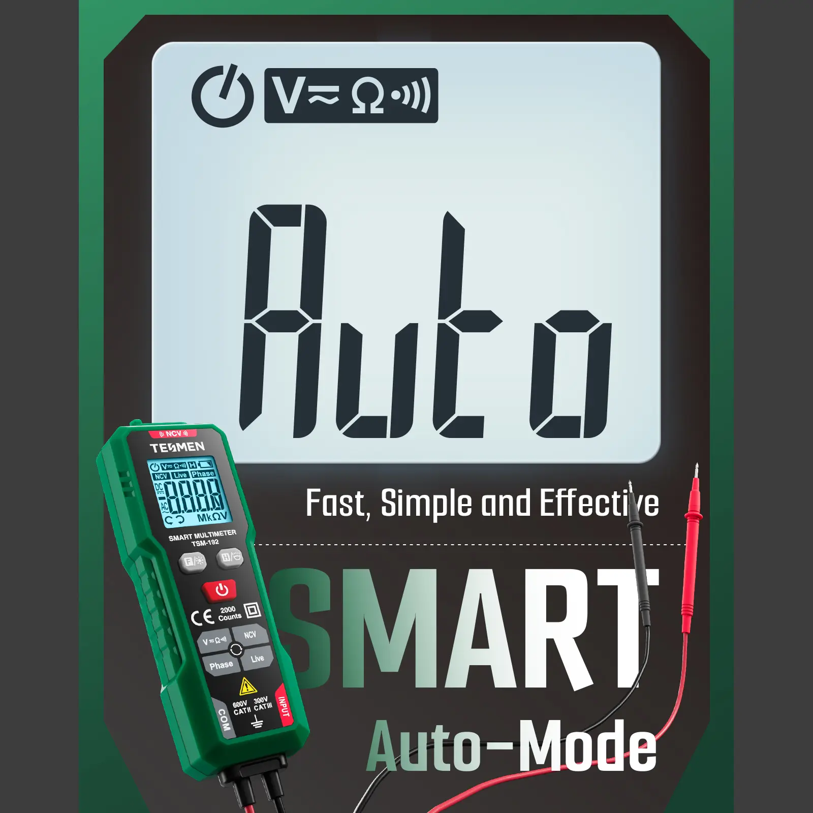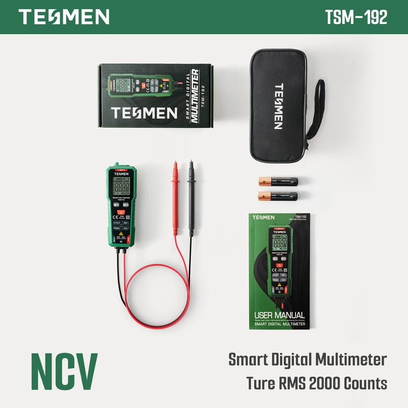 ·【Smart Digital Multimeter】Thanks to its Smart Auto Mode, TESMEN TSM-192 2000 counts smart digital multimeter allows you to quickly switch between all measurement tasks, including AC/DC voltage, resistance, phase, continuity and live wire, without selecting a mode or range. It makes measuring work easy, fast, and accurate.