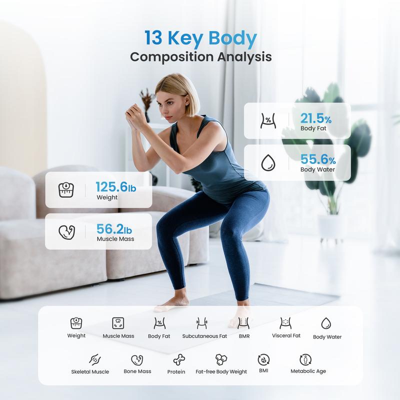 13 essential body measurements :Body Weight, BMI, Body Fat %, Protein, BMR, Fat-free Body Weight, Muscle Mass, Bone Mass, Body Water, Skeletal Muscle, Subcutaneous Fat, Visceral Fat, Metabolic Age