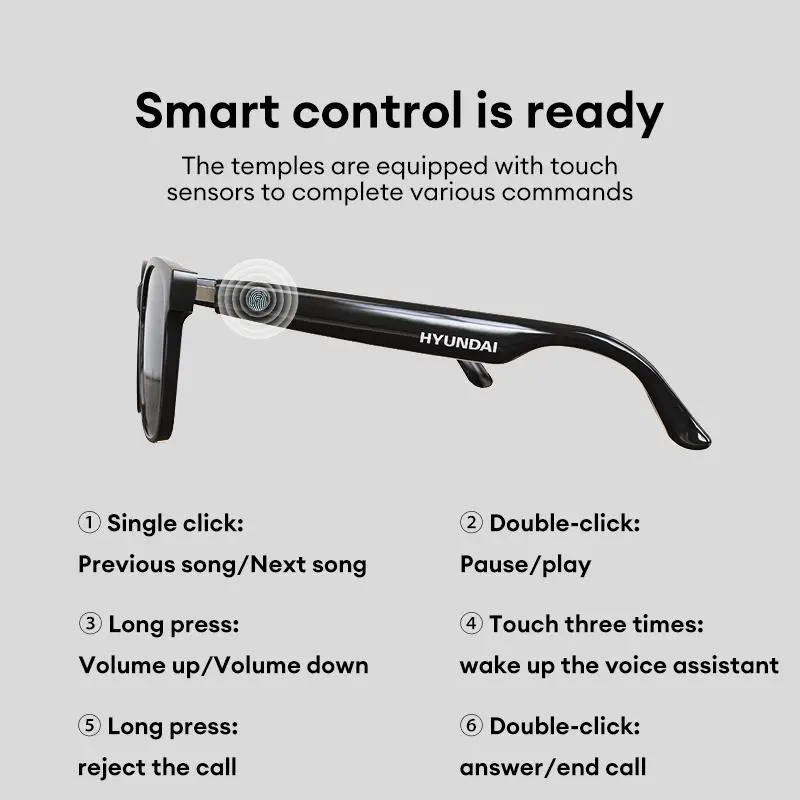 Ever wished your sunglasses could do more than just block the sun? Meet the HYUNDAI C8 Wearable Smart Glasses—your new favorite tech companion for music, calls, and capturing moments hands-free. These stylish glasses blend fashion with function, featuring lightweight 30g frames and comfy non-slip nose pads that stay put during your busiest days or workouts. Thanks to Bluetooth 5.4, enjoy stable wireless audio up to 10 meters away from your phone. Control your tunes, answer calls, or launch your voice assistant with simple touch sensors on the temples—no fumbling for your phone needed. The built-in high-sensitivity microphone and noise reduction tech ensure your voice comes through crystal clear, even in noisy environments. Plus, snap photos on the fly without missing a beat. With a quick 1-hour charge powering a 55mAh battery, these glasses keep up with your active lifestyle. Whether you're jogging, commuting, or just chilling outdoors, HYUNDAI C8 smart glasses make everyday moments smarter and more fun. Ready to upgrade your eyewear game? Grab a pair and step into the future of wearable tech today!