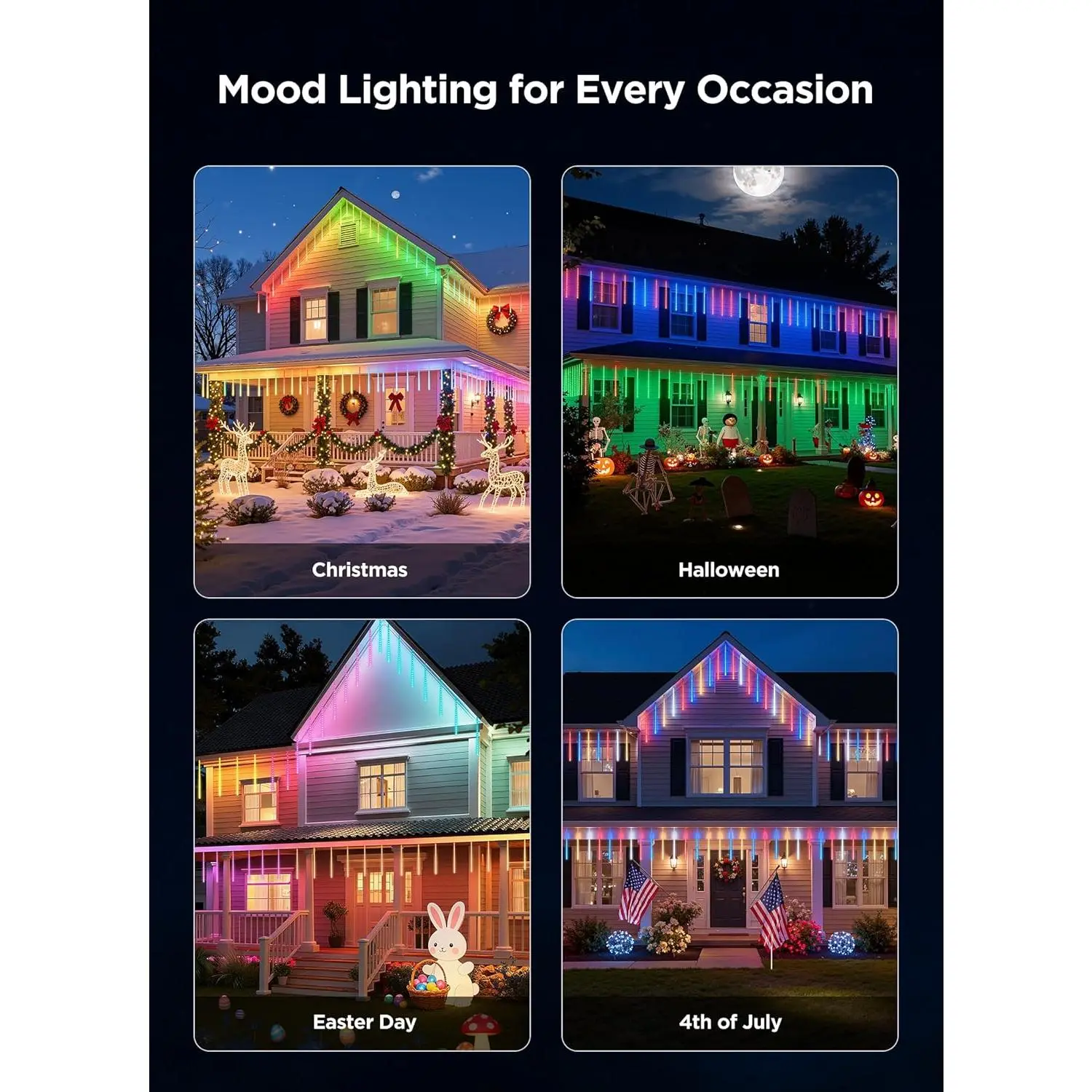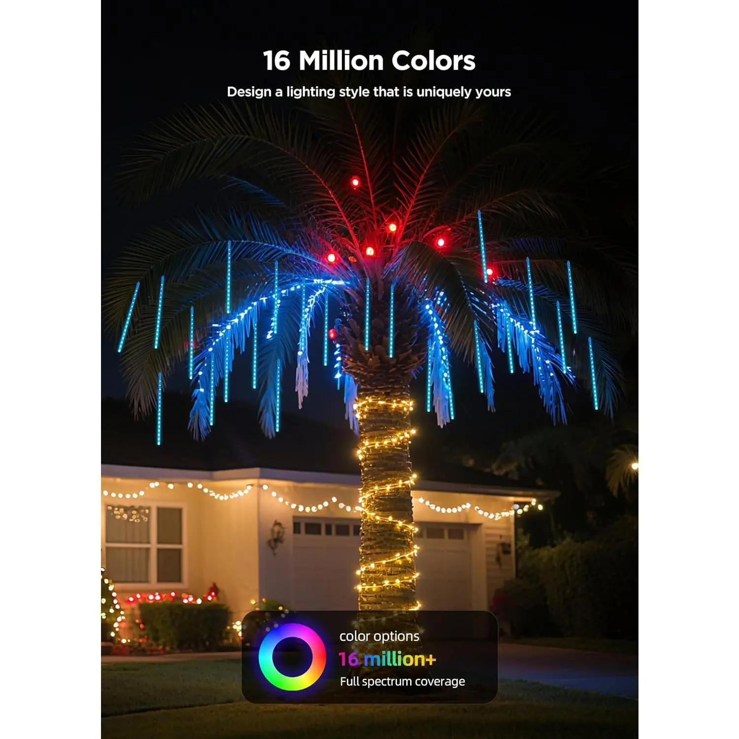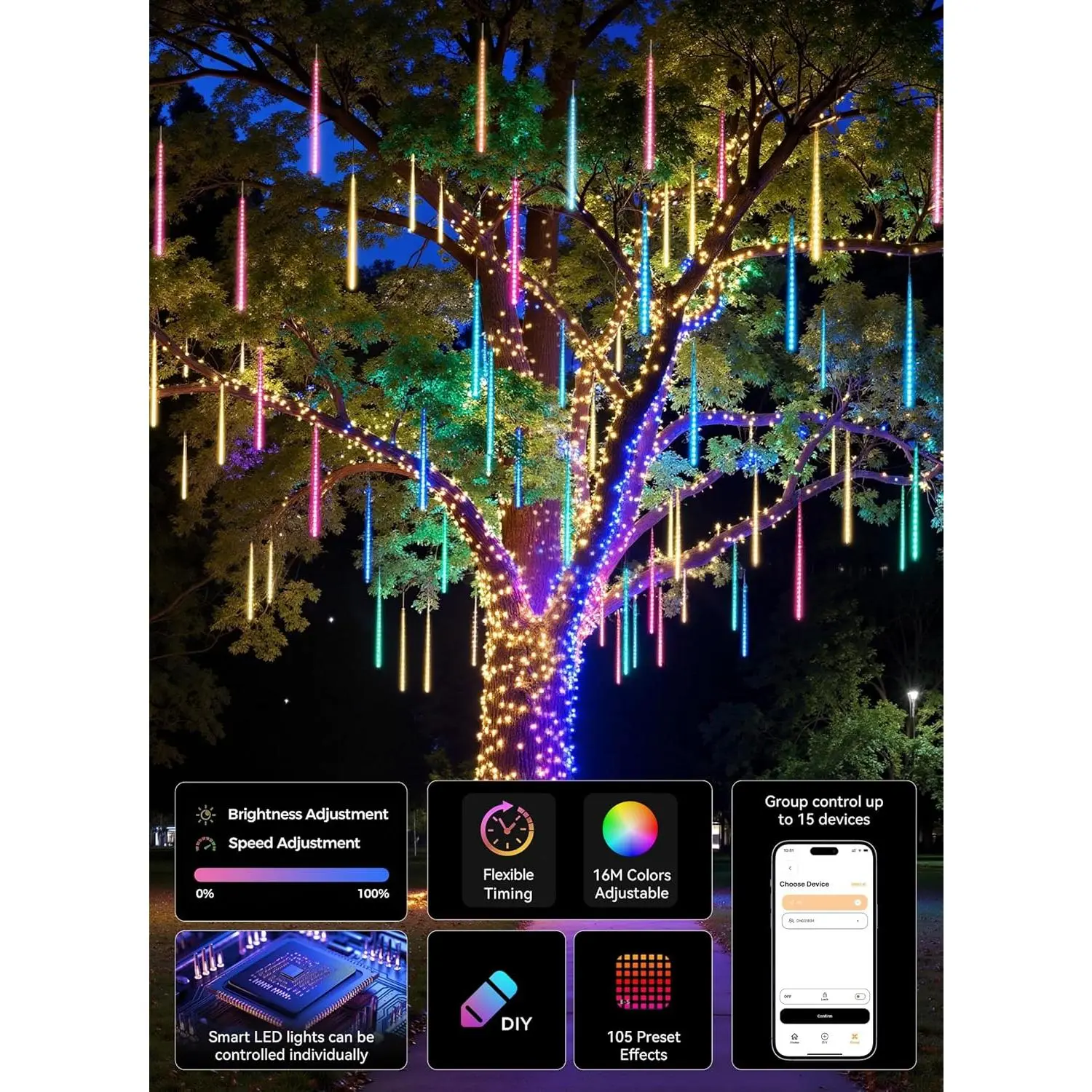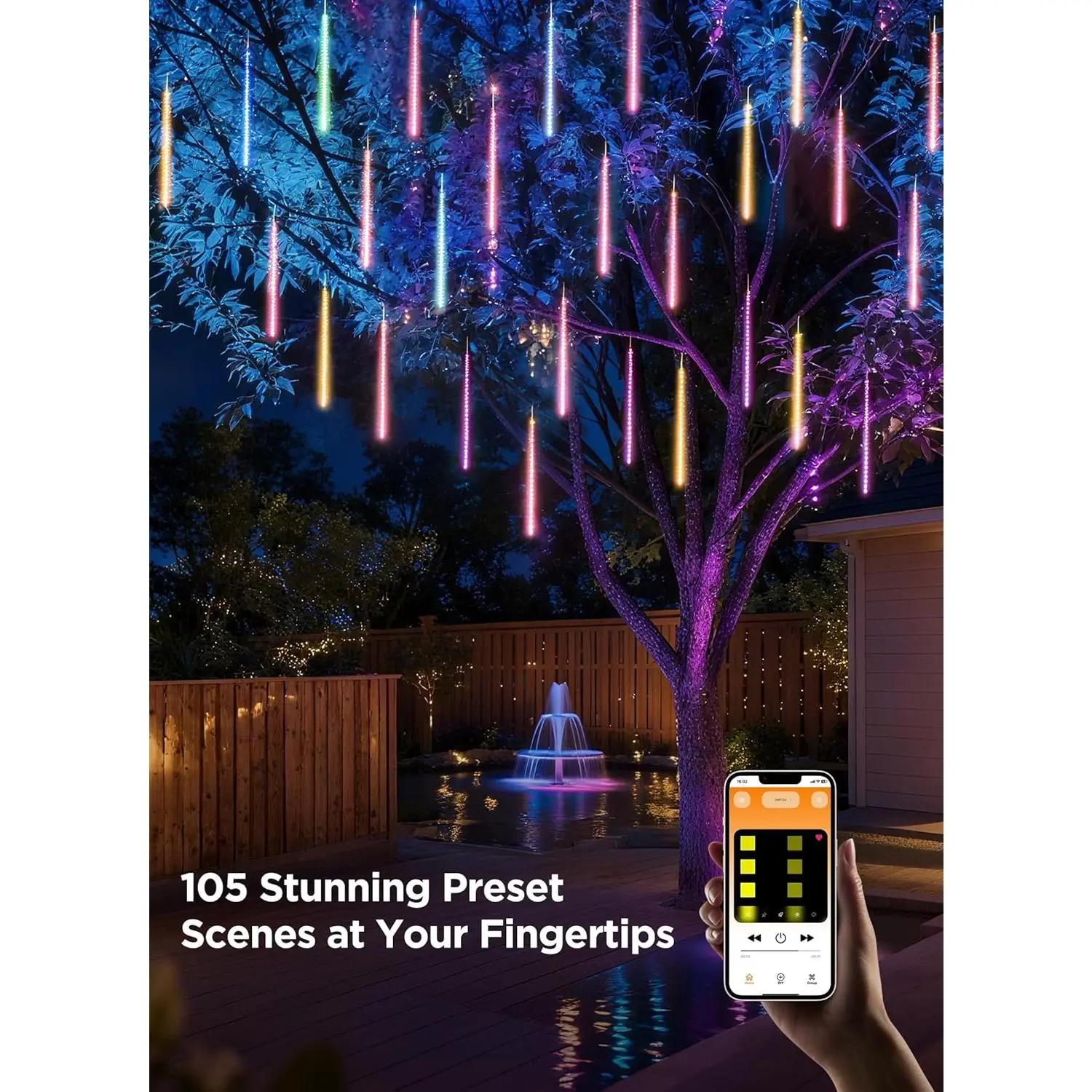 These smart meteor shower lights are ideal for accentuating houses, roofs, awnings, windows, Christmas trees, walls, stair rails, indoor, and outdoor use. Perfect for holidays, weddings, and parties.