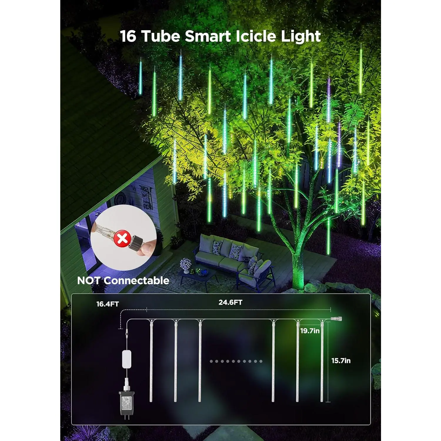 Each icicle string light is 24.6 ft long, with 16 tubes, 19.69 in string wire between each tube, and an extra 16.4 ft of lead wire for convenient connection. Note: These lights are not connectable.