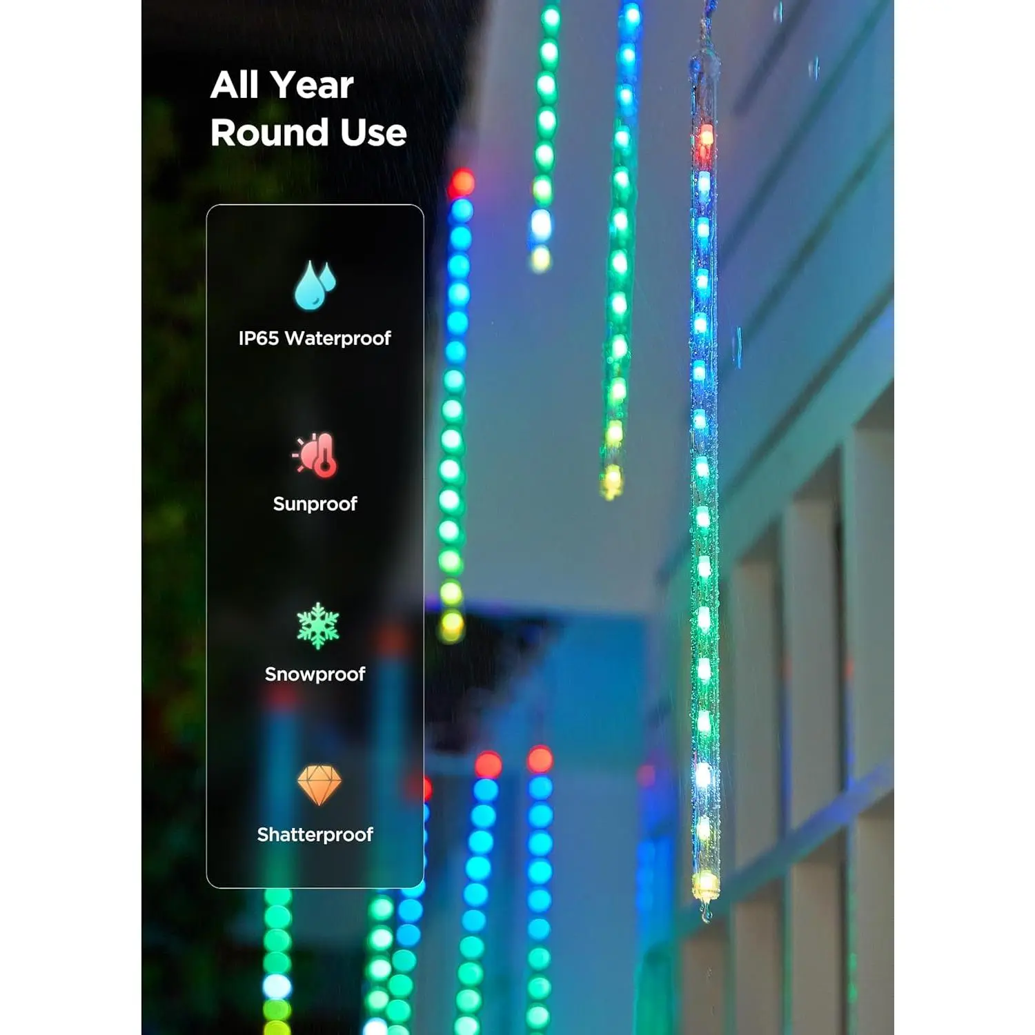 These LED Meteor Shower Icicle Lights have an IP65 waterproof rating, shatter-proof, freeze-proof, and wind-proof. Perfect for winter weather and outdoor use. Create magic for Halloween, 4th of July, summer evenings, and fall gatherings.