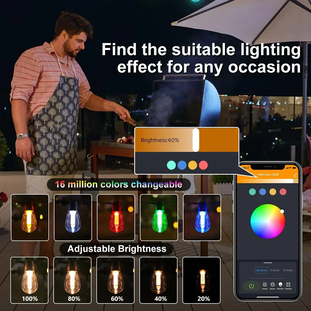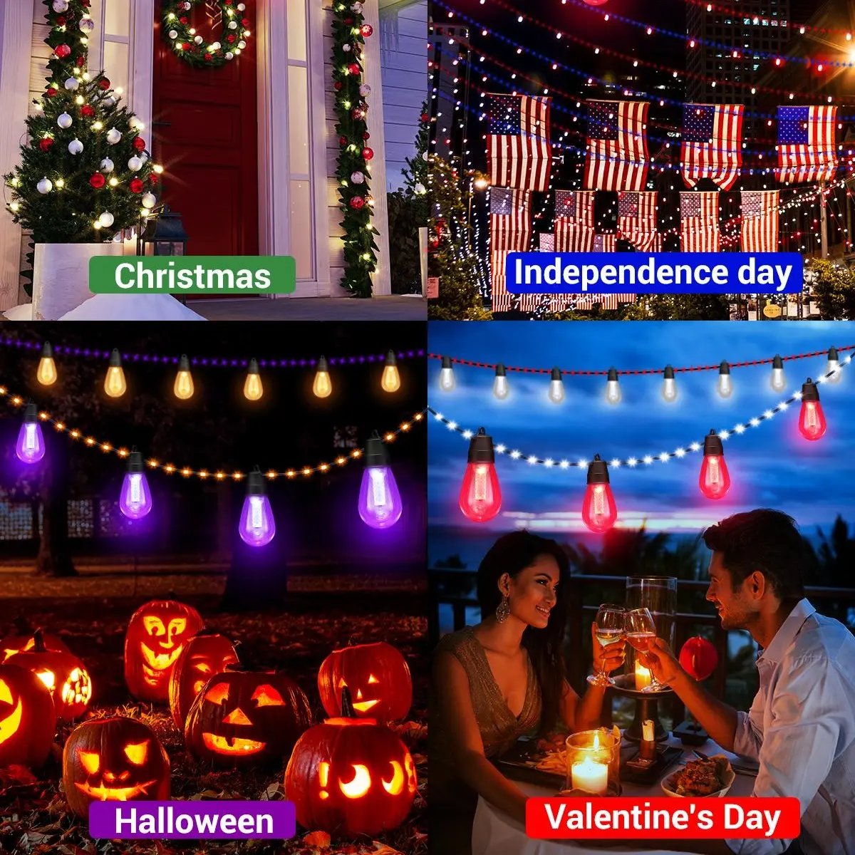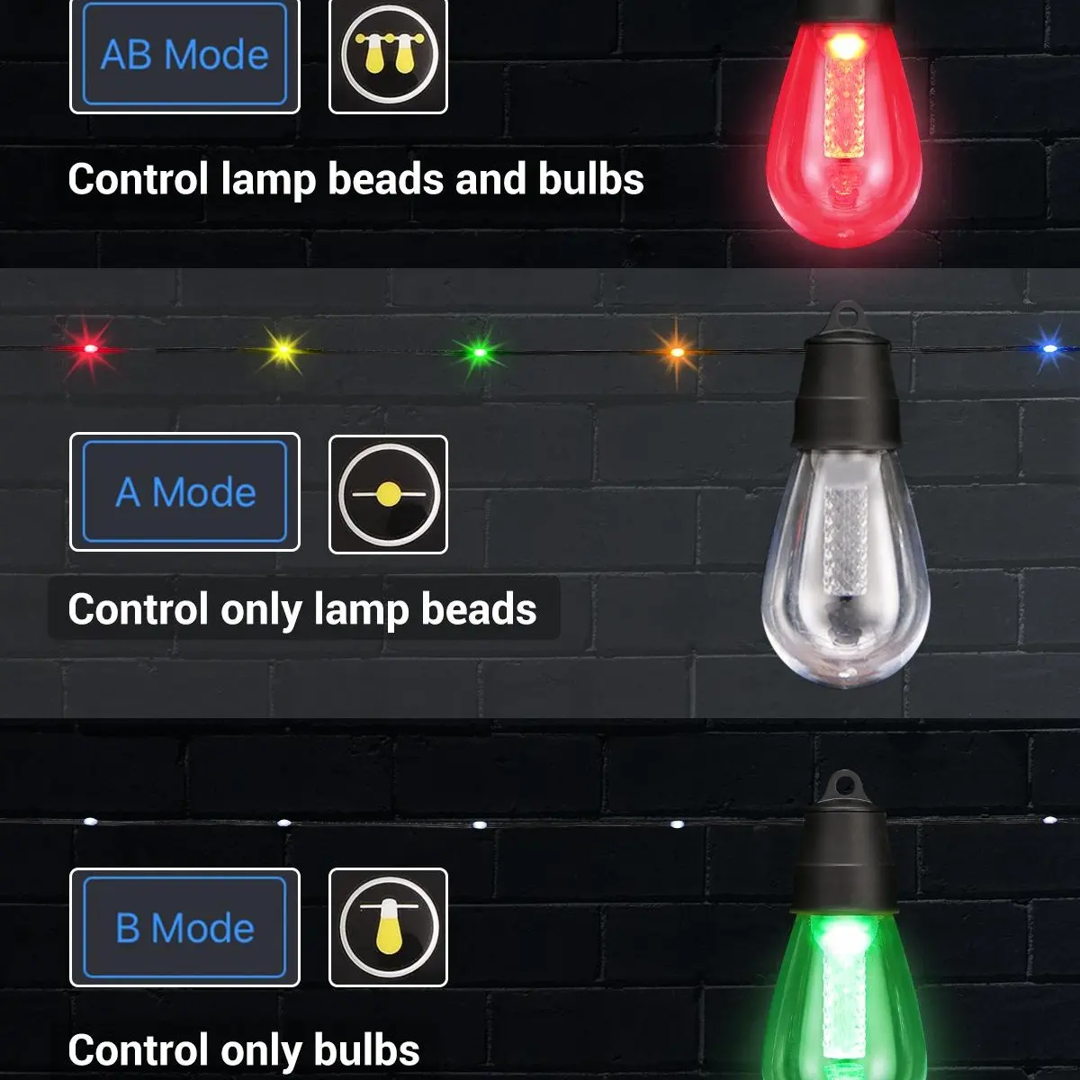 ·3 Control Modes for Any Occasion:Our outdoor light string features 3 control modes (AB mode, A mode, B mode). With customized bulbs and beads, it can display a variety of colors and scene modes, perfectly setting the mood for St. Patrick's Day, Valentine's Day, Halloween, Thanksgiving, Christmas, weddings, birthdays, and more.