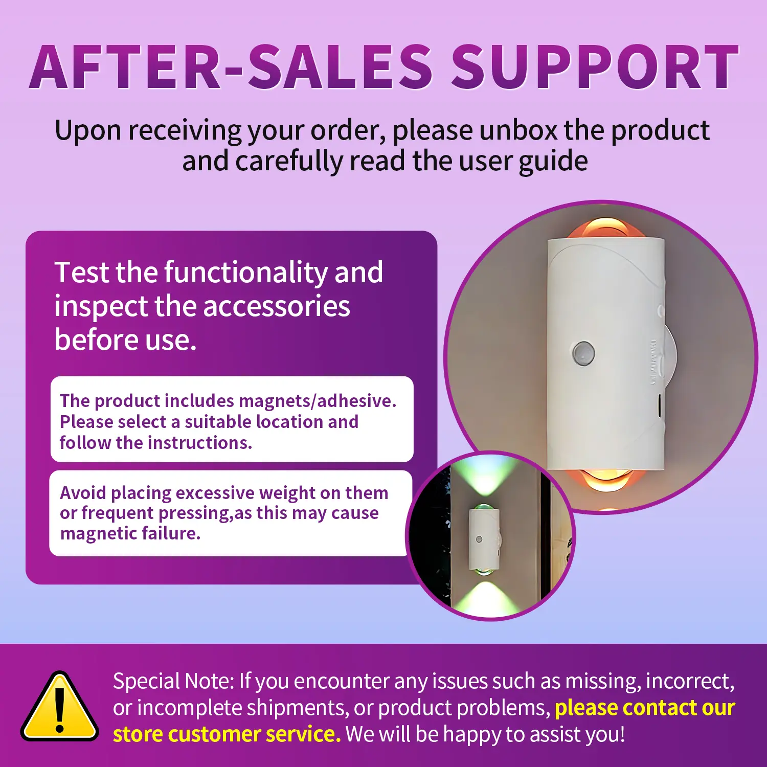 Enjoying product with numerous lights to change on its own with detecting near it. Very nice when you get up and need a near by lid up area when walking to restroom in the dark. Since its rechargeable and easy to use without worrying over battery usage, it perfect to take anywhere for trips.