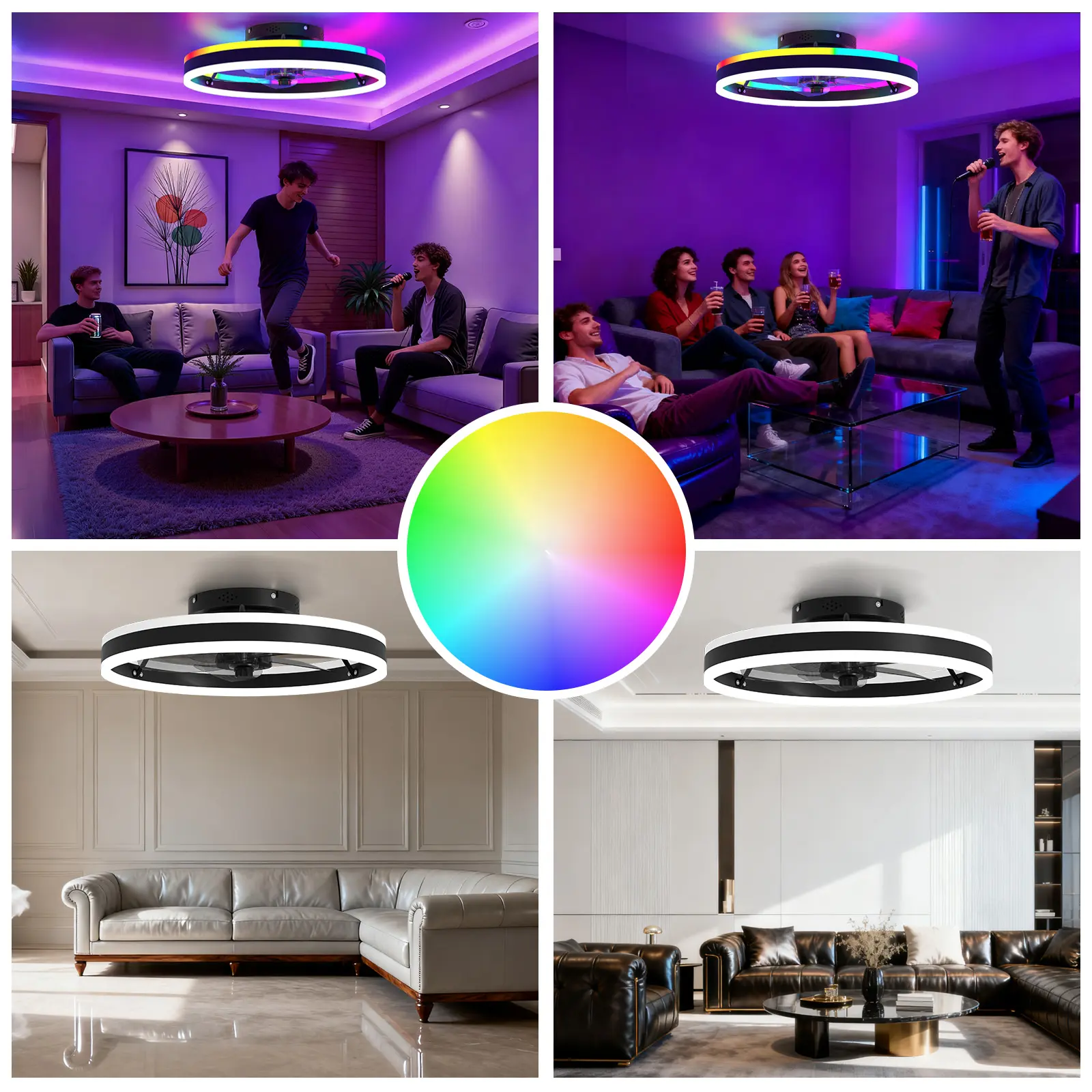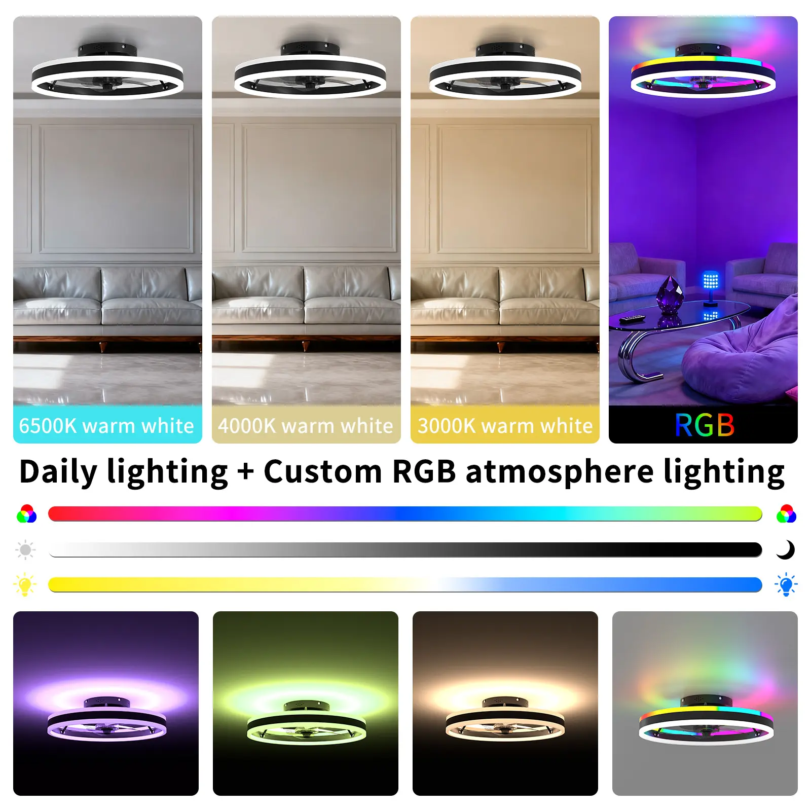 Transform your space with the smart ceiling fan featuring RGBAI 16 million colors and a powerful CCT LED light up to 4500 lumens—as bright as three 100W bulbs. Adjust brightness from 0–100% and switch between warm 2700K to cool 6500K for the perfect atmosphere—whether relaxing, working, or entertaining.