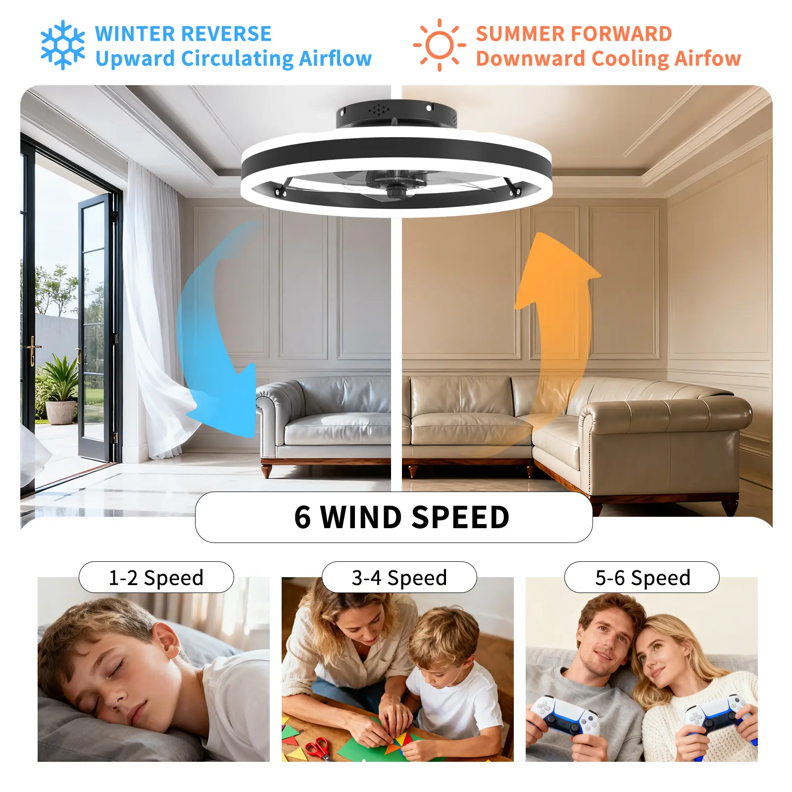 Equipped with a high-performance brushless DC motor, this low-profile ceiling fan delivers up to 1000 RPM and 6 speed levels while saving up to 70% energy compared to traditional AC fans—keeping you cool and saving on bills.