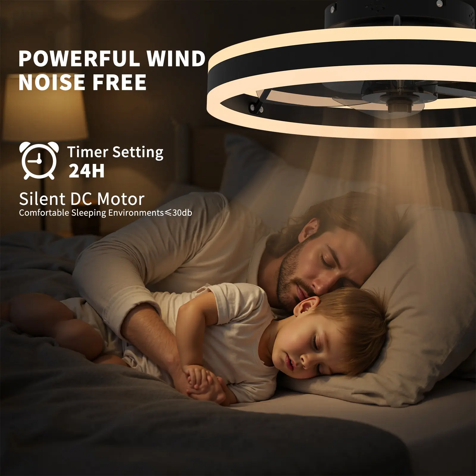 Relax in peace with a 38dB ultra-quiet motor—quieter than a whisper. Ideal for bedrooms, nurseries, and home offices, the ceiling fan ensures undisturbed comfort for sleep or work.