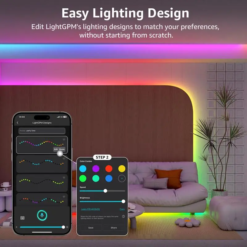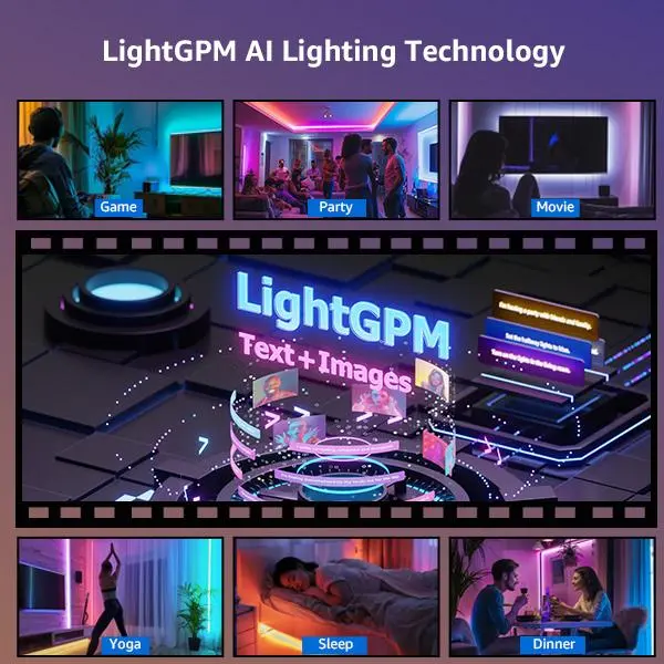 【 Billions of Trillion AI-Generated Scenes】 - By recognizing your emotions and voice commands, LightGPM generates up to 10 best lighting effects from billions of trillion potential lighting effect combinations to offer the best professional designs. Whether you're hosting a holiday party, seeking relaxation, or immersing in the gaming world, each scene is meticulously crafted for a seamless and immersive lighting experience.