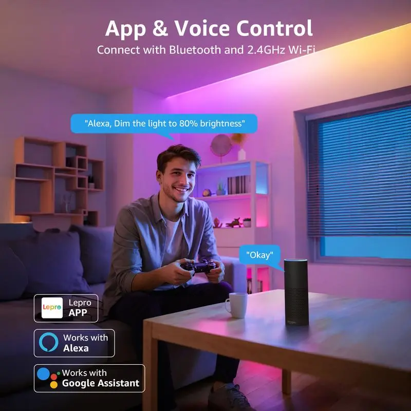 【Advanced Voice Control, Easy to Use】 - The Lepro app features an integrated voice assistant, making voice commands a breeze. Lepro AI can do more than just turn the lights on or off and change colors. By simply telling it what you're doing and how you feel, it will suggest the perfect lighting effects for you right away.
