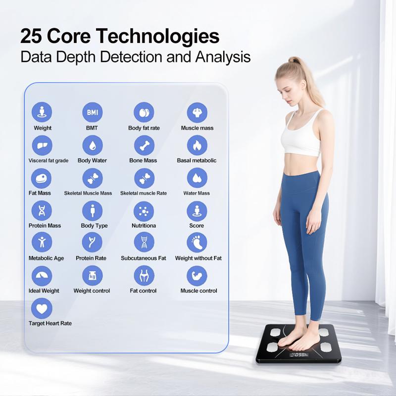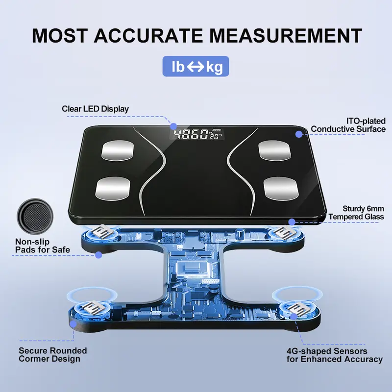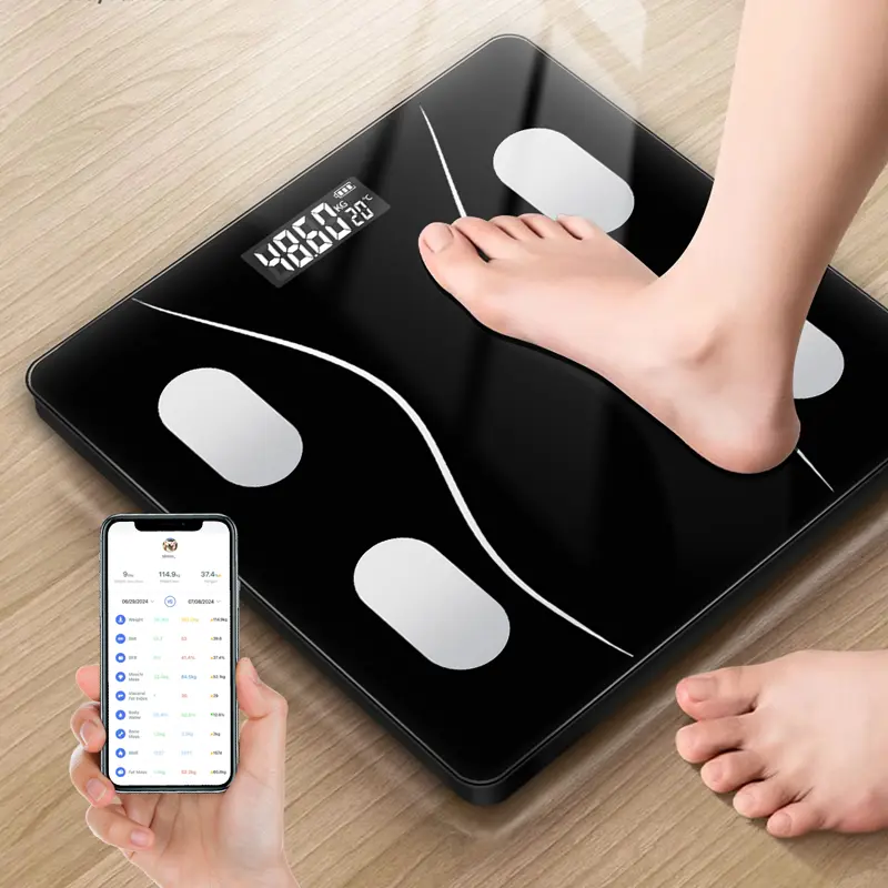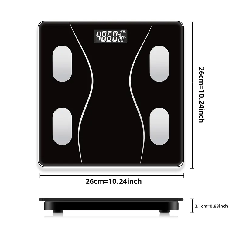Elevate your health tracking with this 7-color glowing Bluetooth digital scale. It's designed for BMI and body fat monitoring. The scale features a smartphone app for easy data analysis. Perfect for those aiming to manage their weight effectively.