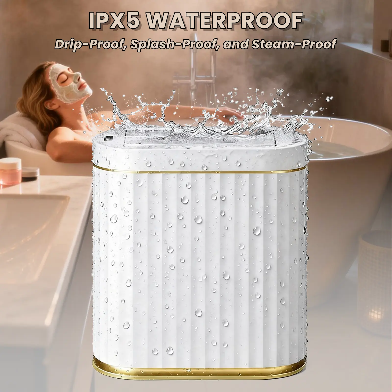 Made of 1.5cm ABS material, the bathroom trash can has an IPX5 waterproof rating—resisting hot steam from 40-minute showers, direct splashes from the showerhead, and accidental water spills when rinsing toothbrushes or washing faces. Simply wipe the automatic trash can with a dry cloth after getting wet, and no water stains remain, even after cleaning with a damp sponge. Its low-center-of-gravity design and extended non-slip feet keep the motion sensor trash can stable: kids running around, pets brushing past, or accidental bumps won’t tip it over, even on smooth tile or wooden bathroom floors.