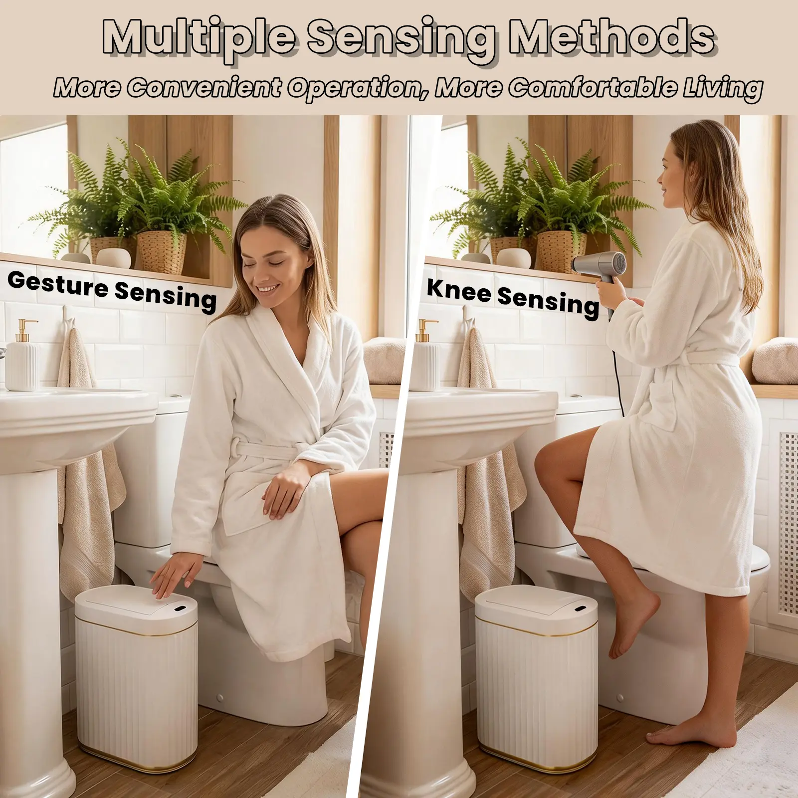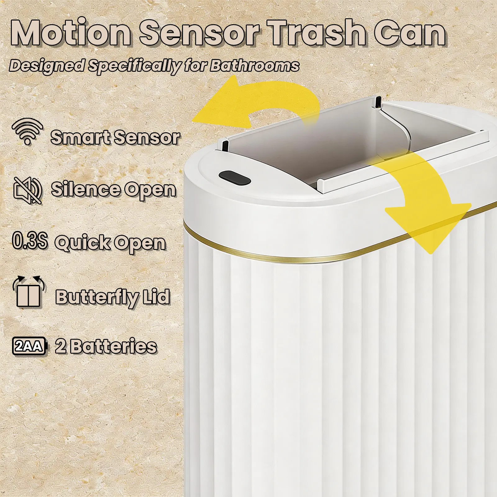The bathroom trash can adopts infrared sensing technology, enabling lid opening without touching—no need to grab wet tissues or garbage when showering, washing hands, or doing skincare in humid bathrooms. The bathroom trash can with lid detects motion within 0-35cm and opens in 0.3 seconds, supporting gesture (wave your hand) and knee sensing: perfect for when you’re on the toilet (legs inconvenient), applying a face mask, blow-drying hair, or holding cosmetics. The lid closes automatically after 5 seconds, ensuring hassle-free waste disposal. Requires 2 AA batteries.