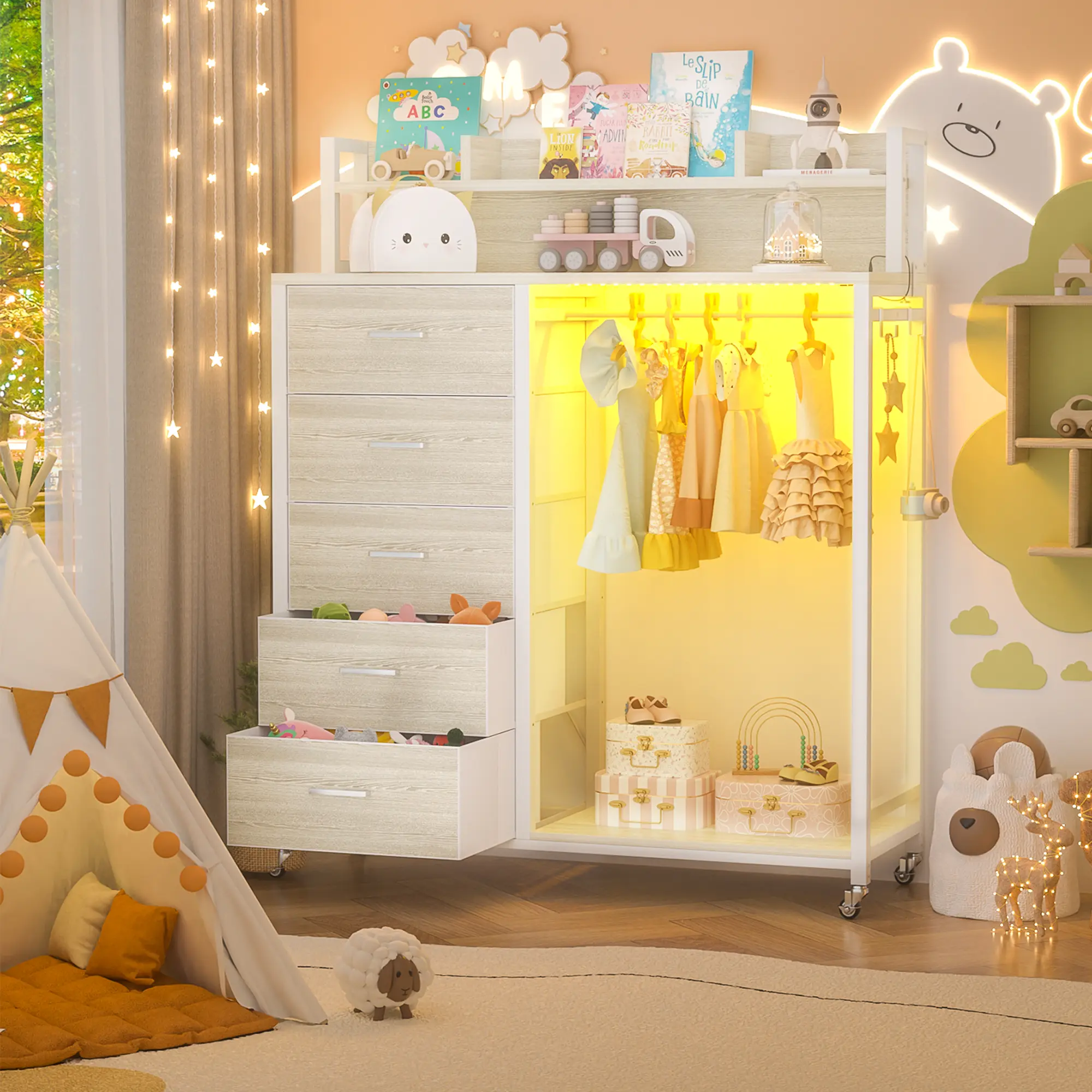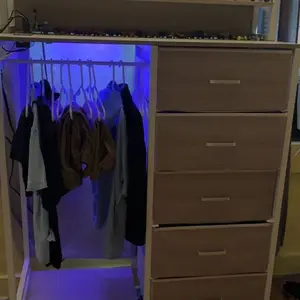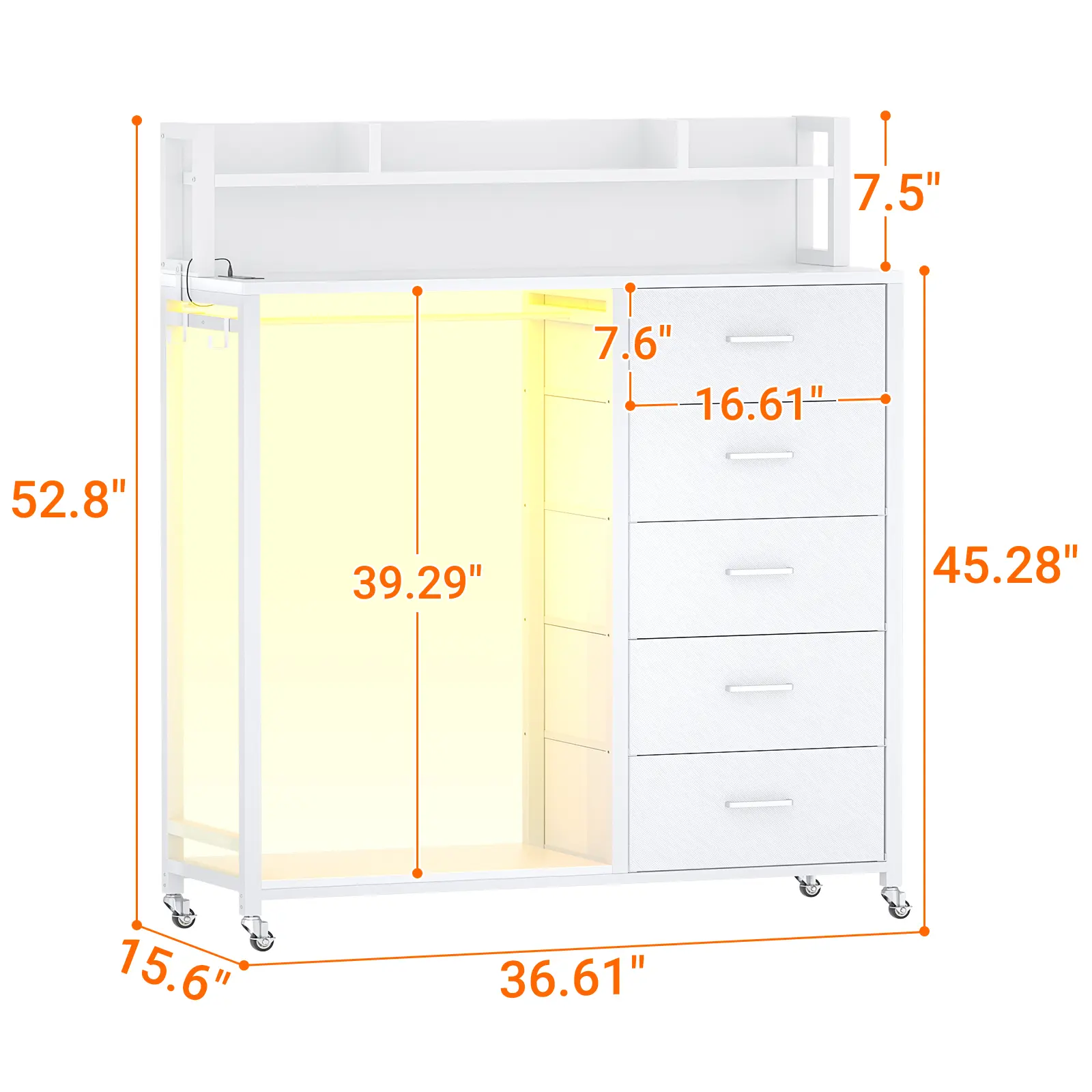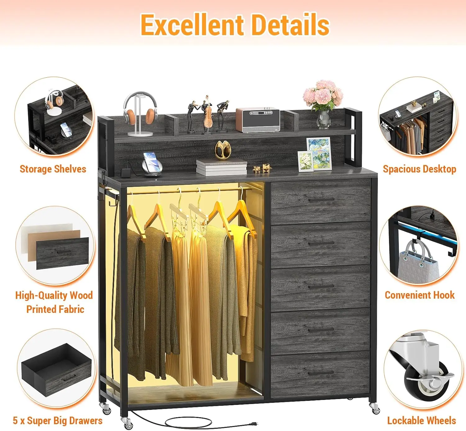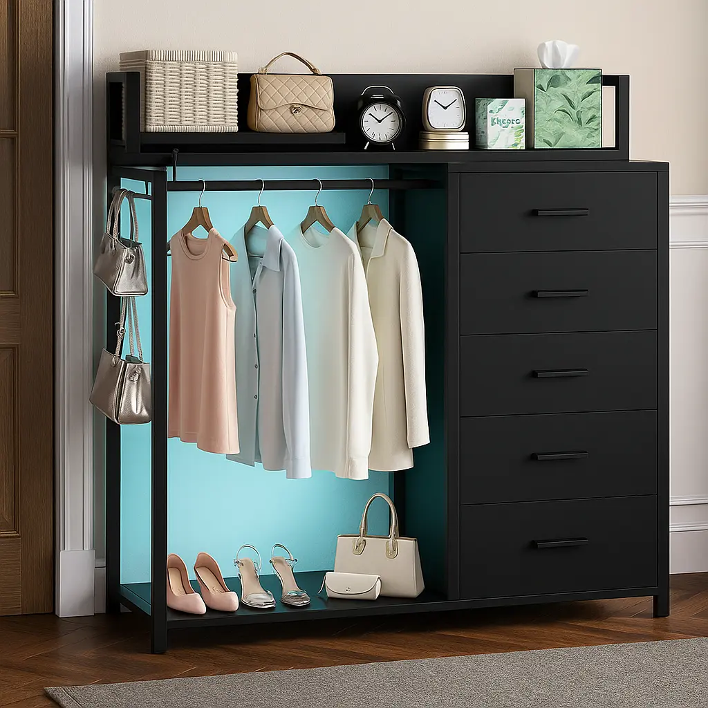 No need for separate storage—this dresser + closet hybrid holds 70+ pairs of jeans in 5 drawers while providing hanging space for shirts, jackets, and more. Save money & square footage with one sleek unit.